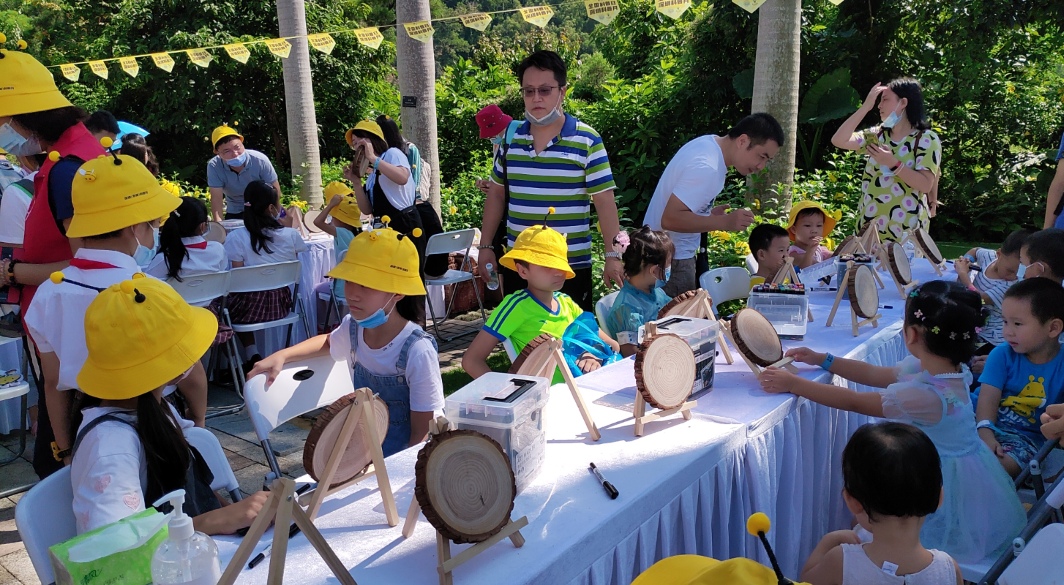 在自然課堂,分為科普展覽區(qū)、繪畫活動區(qū)和蜂產(chǎn)品體驗區(qū),孩子們戴著黃色的卡通帽子,像一只只勤勞的小蜜蜂忙碌地參與各項活動。在科普展板前,他們認真記錄蜜蜂的基本知識、品質(zhì)精神,了解蜜蜂與人類的關系、保護生物多樣性的重要性,家長們結合展板耐心講解《深圳經(jīng)濟特區(qū)科學技術普及條例》、全國科普日、深圳科普月等知識。
