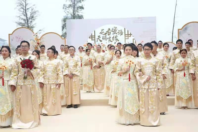 活動(dòng)伊始,新人手舉紅傘穿過(guò)連理橋,在玫瑰園情話闖關(guān),在中西禮堂進(jìn)行找新娘等默契互動(dòng),在自然展覽廳俯瞰香蜜公園全貌,與林立高樓與大片叢林相映成景的最美天際線合影,最后在氤氳浪漫的花香湖和花蜜湖畔,在親友與來(lái)賓的祝福下,40對(duì)新人身穿中式禮服,誦讀莊嚴(yán)的誓詞,許下今生不變的承諾。