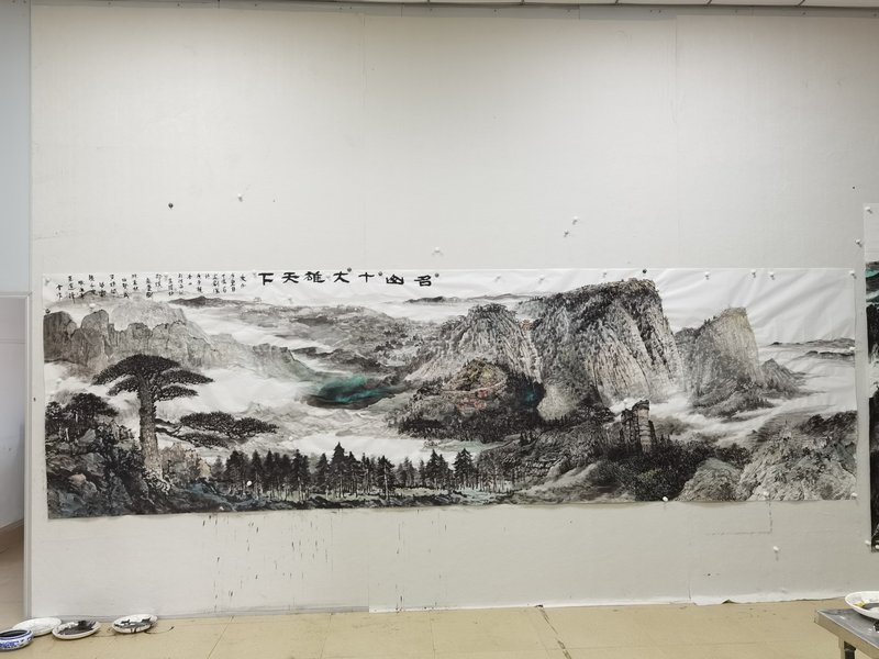 本次活動(dòng)邀請(qǐng)的以李耀林先生為代表的十位畫家,都是當(dāng)代山水畫創(chuàng)作的高手,為體現(xiàn)“名家繪名山”活動(dòng)的創(chuàng)作意義及交流價(jià)值,十位畫家精心策劃,構(gòu)思精巧地創(chuàng)作完成了一巨幅名山圖——《名山十大雄天下》。創(chuàng)作中,畫家們以各自創(chuàng)作特長(zhǎng)及手法,將泰山、黃山、廬山、華山、五臺(tái)山、峨眉山、武夷山、武當(dāng)山、長(zhǎng)白山、觀音山十大名山的代表性景點(diǎn),融于畫中,一氣呵成。鄒繼海先生在名山圖上,欣然撰序題詞“名山十大雄天下”。李耀林先生介紹到,能夠在短期內(nèi)創(chuàng)作出融入十大名山精華元素的鴻篇畫作,十分講究技巧,是難得的創(chuàng)作佳話。此畫作將被名山文化與自然教育分會(huì)收藏、展出。