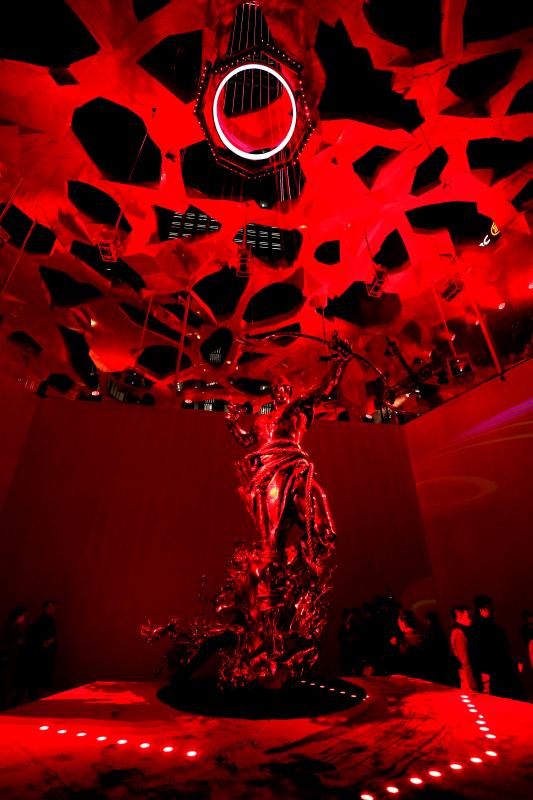 大型沉浸式藝術(shù)裝置“赤子心”橫跨了平安金融中心商場(chǎng)九至十層平臺(tái),總占地面積近四千平方米。在展出十五件大型雕塑作品的同時(shí),將光影藝術(shù)與聲音藝術(shù)巧妙融合,串聯(lián)起虛擬影像與現(xiàn)實(shí)空間,以闡釋純粹、無畏的赤子之心?!俺嘧有摹笔褂^眾走入藝術(shù)品內(nèi)部、探索藝術(shù)家的內(nèi)心深處,通過親身參與展覽并與之對(duì)話,從而理解“其大無外,其小無內(nèi),世界即內(nèi)心投射”的本質(zhì)。