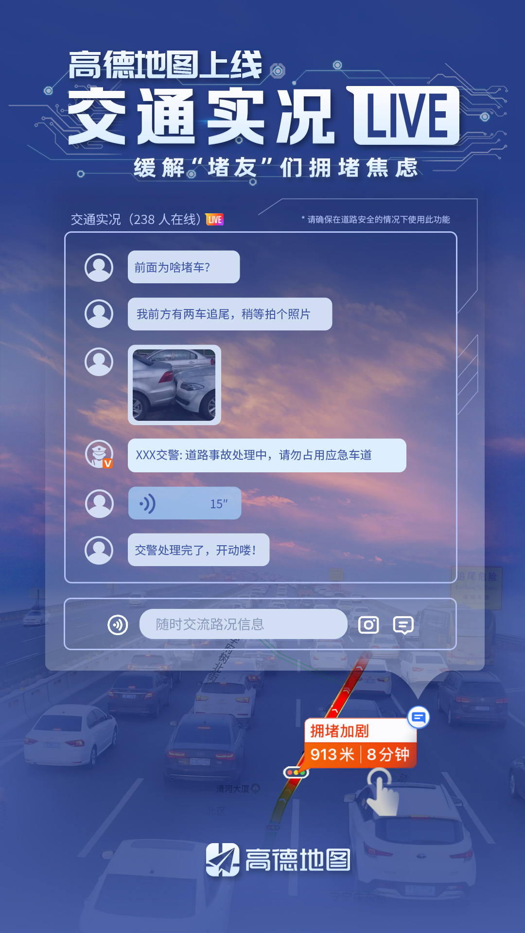 通過這個(gè)平臺(tái),各地交管部門可及時(shí)發(fā)布擁堵事件的權(quán)威信息,如擁堵原因、派警情況、預(yù)計(jì)疏通用時(shí)及現(xiàn)場(chǎng)圖片等。當(dāng)用戶進(jìn)入嚴(yán)重?fù)矶侣范螘r(shí),通過點(diǎn)擊提醒氣泡即可進(jìn)入該界面,實(shí)時(shí)了解擁堵信息。在車輛因堵車無法行進(jìn)時(shí),“堵友”們還可以互通有無,通過文字、語音、圖片等多種方式,為后方司機(jī)分享第一手信息。而當(dāng)擁堵疏散時(shí),“交通實(shí)況”功能也將自動(dòng)關(guān)閉。