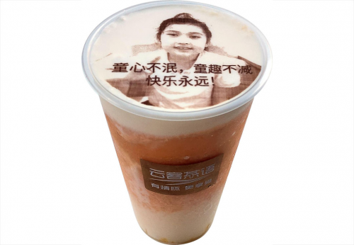 建議由孩子把自己或家人的照片加上一句話祝愿的話,作成圖片先保存到手機(jī)里。到店后,在云客茶語小程序上傳打印到奶茶上。整個(gè)制作過程約10分鐘。