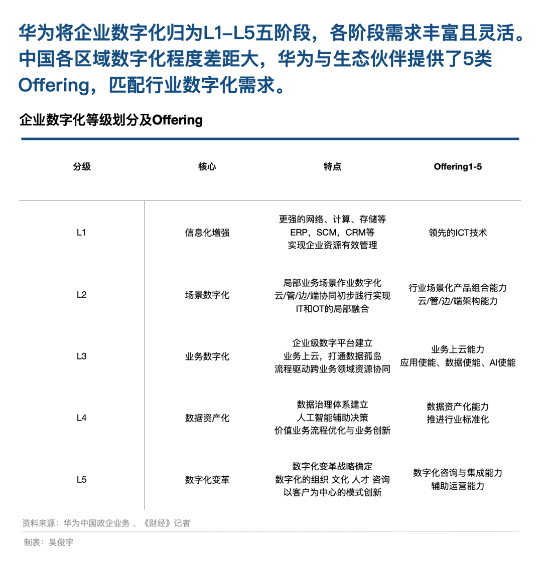 應(yīng)對每個(gè)階段的數(shù)字化挑戰(zhàn),需要提供可靈活搭配的能力,其中可能涉及ICT技術(shù)這類L1級能力,也可能涉及數(shù)字化咨詢、集成、輔助運(yùn)營這類L5級能力。為此,華為攜手伙伴提供了5類Offering。