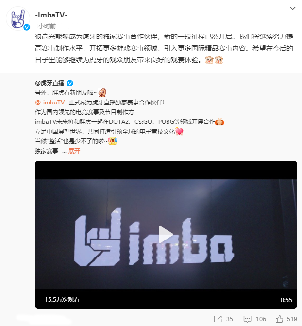本次虎牙公司和imbaTV達(dá)成合作,不僅能加強(qiáng)雙方在DOTA2、CS:GO、PUBG等品類賽事上的優(yōu)勢,也與虎牙對電競賽事多元布局的計劃高度契合。