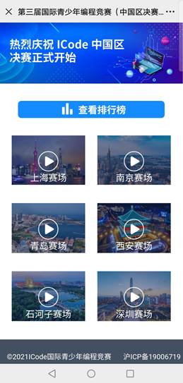 ICode2021中國區(qū)決賽每個(gè)分賽場都安排賽況實(shí)時(shí)直播,個(gè)人全國排行榜/分賽場排行榜實(shí)時(shí)可見。家長及帶隊(duì)老師們可以時(shí)刻掌握孩子的闖關(guān)進(jìn)度。選手比賽名次透明且公開,家長和帶隊(duì)老師雖身不在考場,但心依舊可以感受到選手的努力和創(chuàng)意,ICode架起選手與家長和老師之間的橋梁,為每一步小小 的 前進(jìn)而喝彩。