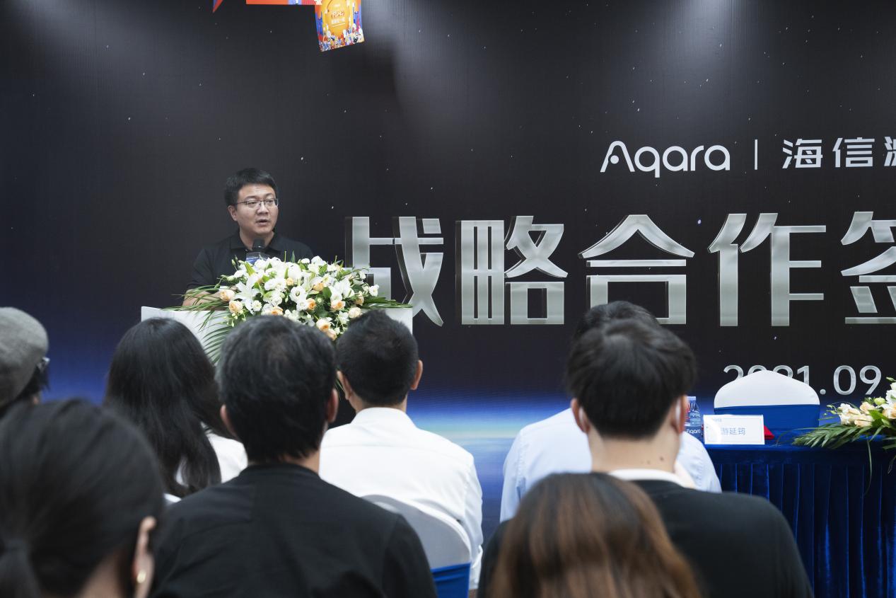 致辭環(huán)節(jié),海信集團(tuán)控股公司副總裁于芝濤也發(fā)來了線上祝福視頻,表達(dá)了對(duì)這次雙方合作,共同致力全屋智能美好體驗(yàn)再升級(jí)的美好祝愿。與此同時(shí),青島海信激光顯示股份有限公司的副總經(jīng)理王偉介紹了海信電視在戰(zhàn)略發(fā)展方向上的重塑新定位、新技術(shù)應(yīng)用、產(chǎn)品優(yōu)勢(shì)以及所取得的階段性成就等,并表示Aqara作為全球智慧生活方式的先行者和引領(lǐng)者,致力于打造「千人千面」的全屋智能生活方式,要做更懂用戶的“家”,這和海信電視“顯示無處不在,服務(wù)無處不在,連接無處不在”的發(fā)展理念不謀而合。除去智能化,雙方與生俱來的“綠色基因”更加夯實(shí)了這種合作契因,并始終堅(jiān)信,未來海信電視與Aqara將會(huì)不斷用綠色智能科技提升大家的家居生活品質(zhì),打造大屏?xí)r代的綠色客廳,引領(lǐng)中國(guó)IoT的發(fā)展。