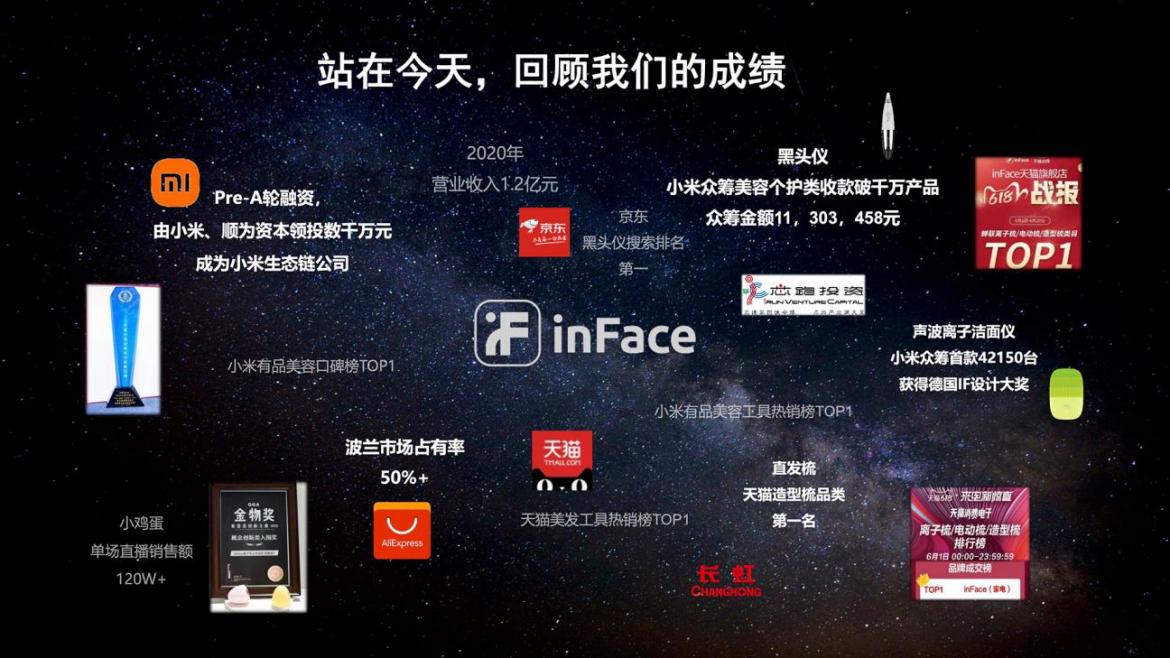 據(jù)了解, inFace創(chuàng)立于2017年6月21日,經(jīng)過近1年籌備,2018-2020年完成了第一個(gè)“三年計(jì)劃”,即實(shí)現(xiàn)成為行業(yè)有代表和開創(chuàng)性“產(chǎn)品型公司”的戰(zhàn)略目標(biāo)。在這期間,inFace發(fā)布原創(chuàng)產(chǎn)品12款+,年?duì)I收超1億元,同時(shí)完成由小米集團(tuán)、順為資本領(lǐng)投的數(shù)千萬元Pre-A輪融資,正式加入小米生態(tài)鏈。在小米有品、天貓和京東等國內(nèi)主流電商平臺(tái)上,核心類目例如潔面儀、黑頭儀、直發(fā)梳、美膚儀和美容儀等產(chǎn)品,inFace都是TOP級(jí)商家。