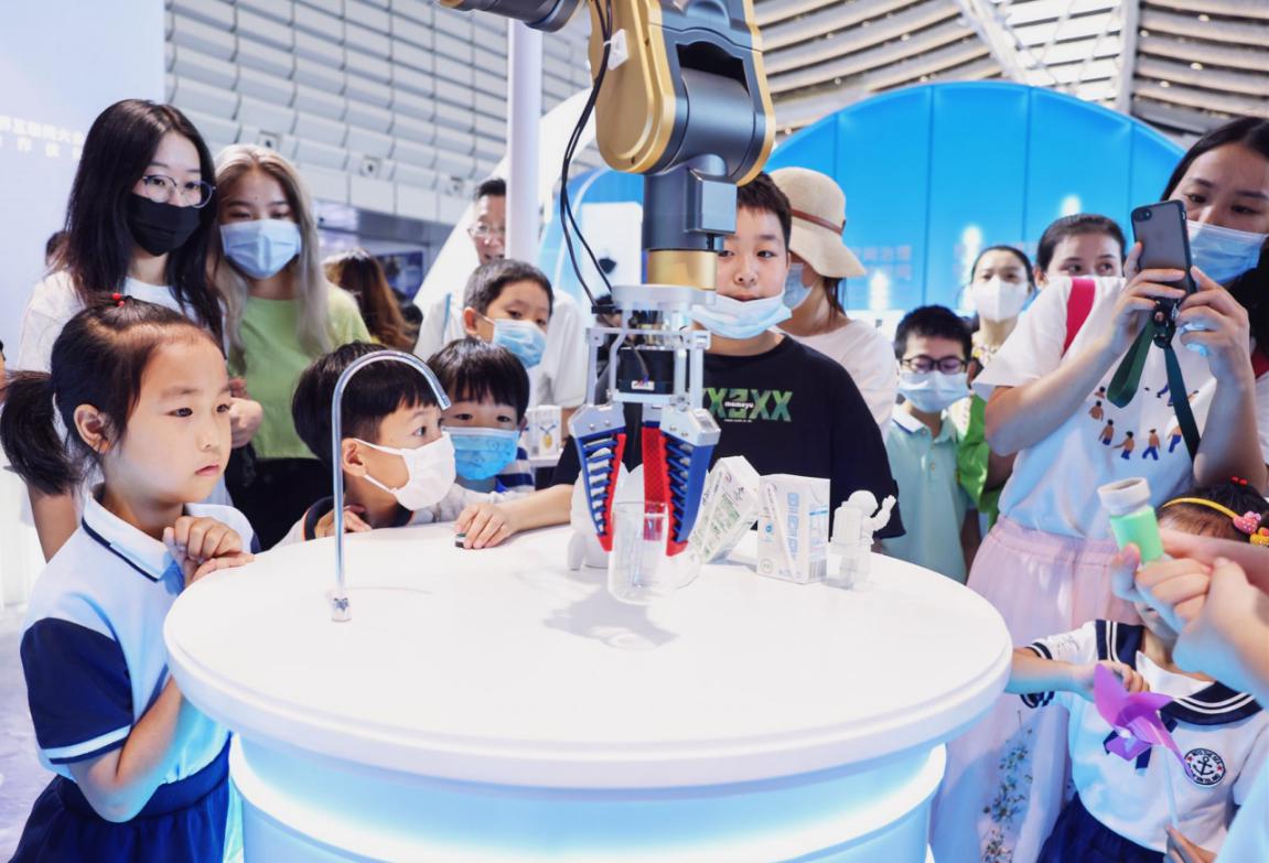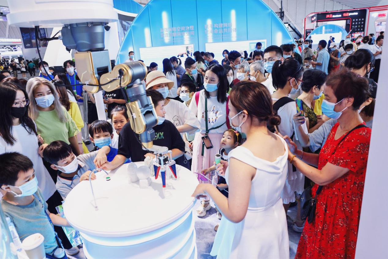 這牛奶和其他的不太一樣,很香濃?!半x心精萃‘白科技’開啟臻濃新紀(jì)元”展臺(tái)一直就是博覽會(huì)現(xiàn)場(chǎng)的“人氣王”,這里以宇宙探索為主題,科幻感十足,火箭發(fā)動(dòng)機(jī)噴出淡淡煙霧,三臺(tái)智能機(jī)械臂不停忙碌,人們排起長(zhǎng)隊(duì),品嘗由“離心精萃科技”現(xiàn)場(chǎng)調(diào)制的伊利臻濃牛奶。在這里,吸引觀眾的不僅是美味的伊利牛奶,也有滿滿的數(shù)字科技。
