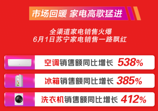 截至昨日18時,空調銷售額同比增長538%;冰箱銷售額同比增長385%;洗衣機銷售額同比增長412%……蘇寧發(fā)布618開門紅全天戰(zhàn)報。家電作為蘇寧的強勢品類,再次領先對手多個身位。
