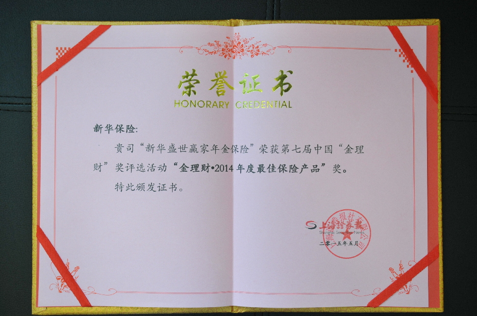 2015年5月28日,上海證券報(bào)主辦的第七屆“金理財(cái)”獎(jiǎng)?lì)C獎(jiǎng)典禮在上海舉行。經(jīng)專家評(píng)審團(tuán)的嚴(yán)格評(píng)審、結(jié)合網(wǎng)絡(luò)投票和微信投票情況,在進(jìn)行綜合評(píng)議后,“新華盛世贏家年金保險(xiǎn)”榮膺最佳保險(xiǎn)產(chǎn)品獎(jiǎng)。