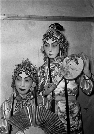 他10歲學(xué)藝,13歲正式登臺(tái)演出《玉堂春》、《四郎探母》等劇目,彼時(shí)的中國正值抗戰(zhàn)的危難時(shí)期,風(fēng)雨飄搖,他的父親為彰顯民族氣節(jié),正蓄須明志,暫別舞臺(tái)。我們?cè)诹鱾飨聛淼奈墨I(xiàn)照片中,只能看見一個(gè)面容清秀的少年,安靜地立于他名聲浩蕩的父親的身后,身體微微前傾——除此之外,我們沒法更多地捕捉到這對(duì)父子之間情感上的細(xì)節(jié),那黑白的畫面,靜穆而有意地拒絕向后人傳遞出更多的信息。