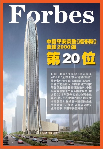 中國平安保險(集團(tuán))股份有限公司連續(xù)第十二年入圍全球上市公司2000強,排名較2015年躍升12位,位列全球第20位。