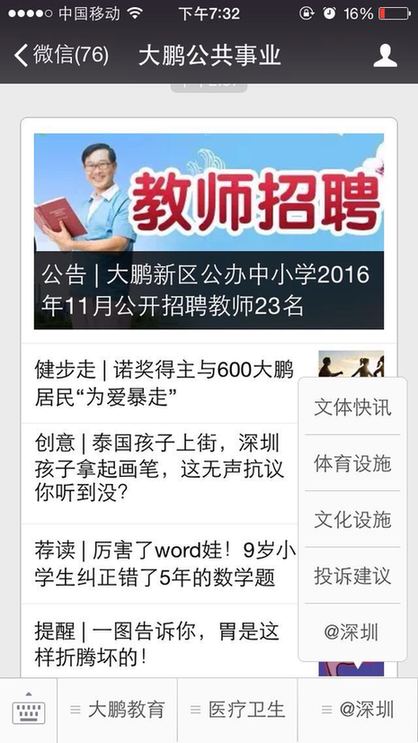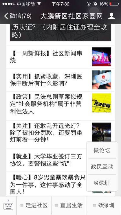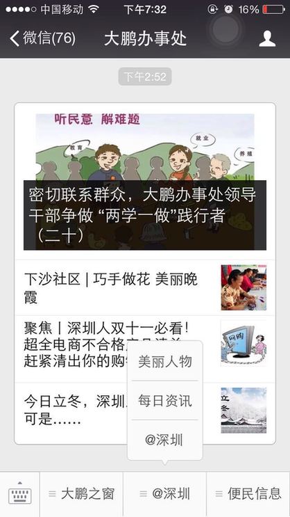 ??? 截止到11月7日,大鵬新區(qū)已有大鵬先鋒、大鵬新區(qū)社區(qū)家園網(wǎng)、大鵬公共事業(yè)、筑夢大鵬、、大鵬辦事處等多家政府官方微信公眾號入駐了@深圳。