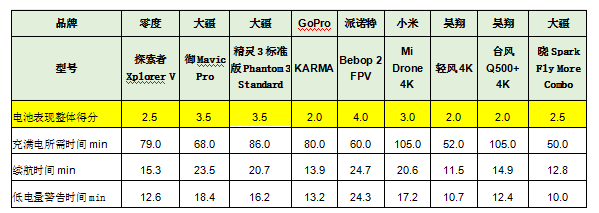 御Mavic Pro”和“精靈3標準版Phantom 3 Standard”,充電時間較短,續(xù)航時間較長,表現(xiàn)較好,獲評3.5分。