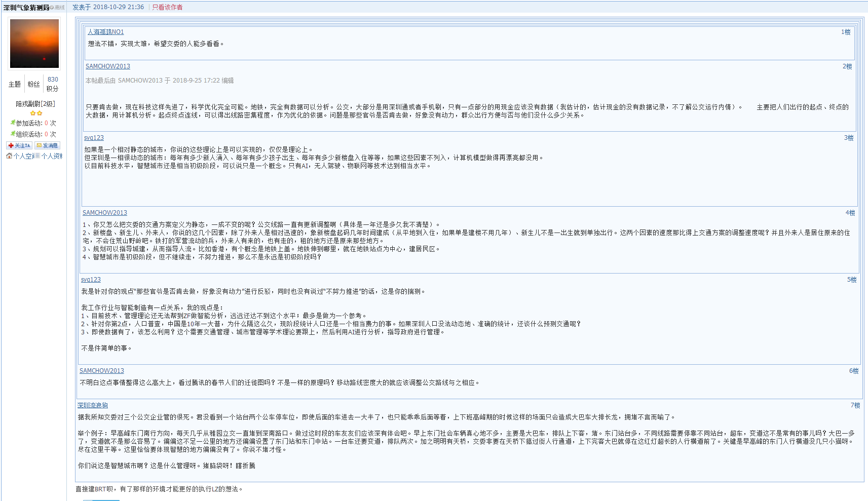 9月25日有市民在深圳論壇以《關(guān)于公交線路規(guī)劃和站臺(tái)設(shè)置的一點(diǎn)建議》為題發(fā)帖,自稱是曾經(jīng)的公交人和現(xiàn)在的私家車駕駛員,對深圳的公交出行一口氣提出3個(gè)意見。帖文中最為吸引人眼球的觀點(diǎn)就是“將全市各站點(diǎn)進(jìn)行編號,采用計(jì)算機(jī)技術(shù),對編號站點(diǎn)進(jìn)行排列組合,每個(gè)方向連續(xù)的10個(gè)站點(diǎn)有三條線路覆蓋,超出三條屬于線路密度高或規(guī)劃不合理?!眴芜@一句話就在跟帖中引發(fā)了針鋒相對的辯論,有支持的市民認(rèn)為:主意不錯(cuò),實(shí)現(xiàn)起來應(yīng)該也難度不大?,F(xiàn)在不是整天提什么物聯(lián)網(wǎng)、大數(shù)據(jù)、智慧城市么,這個(gè)不就是這些高新技術(shù)在公交出行方面的應(yīng)用。不看好的市民則認(rèn)為:目前技術(shù)、管理理論還無法做智能分析,遠(yuǎn)遠(yuǎn)還達(dá)不到這個(gè)水平,“最多是做為一個(gè)參考”。