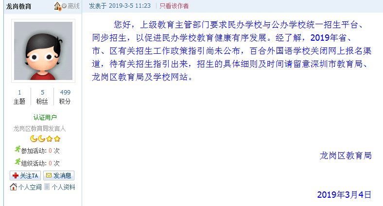 3月5日11時(shí)23分,龍崗區(qū)教育局官方賬號(hào)發(fā)布回應(yīng)網(wǎng)帖,回應(yīng)稱“上級(jí)教育主管部門要求民辦學(xué)校與公辦學(xué)校統(tǒng)一招生平臺(tái)、同步招生,以促進(jìn)民辦學(xué)校教育健康有序發(fā)展。”“2019年省、市、區(qū)有關(guān)招生工作政策指引尚未公布,百合外國(guó)語學(xué)校關(guān)閉網(wǎng)上報(bào)名渠道,待有關(guān)招生指引出來,招生的具體細(xì)則及時(shí)間請(qǐng)留意深圳市教育局、龍崗區(qū)教育局及學(xué)校網(wǎng)站。”