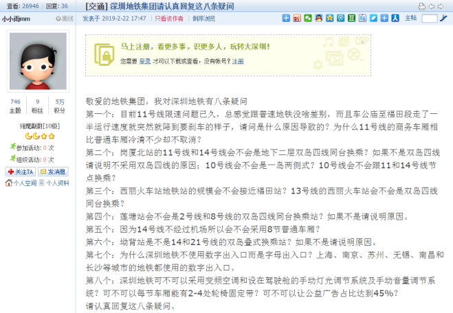 2月22日,有市民在深圳論壇發(fā)帖《敬愛的地鐵集團(tuán),我對深圳地鐵有八條疑問》,對深圳地鐵提出一系列專業(yè)且詳細(xì)的問題:“11號(hào)線限速問題由來已久”“11號(hào)線商務(wù)車廂比普通車廂冷清不少卻不取消”,對新建地鐵線路的換乘方式、14號(hào)線采用普通車廂還是商務(wù)車廂、西麗站的規(guī)模等建設(shè)方案提出疑問,并質(zhì)疑地鐵站出入口使用字母標(biāo)識(shí)而不是數(shù)字標(biāo)識(shí)是否合理。帖文中也提出了“采用變頻空調(diào)”“手動(dòng)燈光調(diào)節(jié)系統(tǒng)及手動(dòng)音量調(diào)節(jié)系統(tǒng)”“每節(jié)車廂能有2-4處輪椅固定帶”等建議,并希望“車站內(nèi)公益廣告占比要達(dá)到45%”。