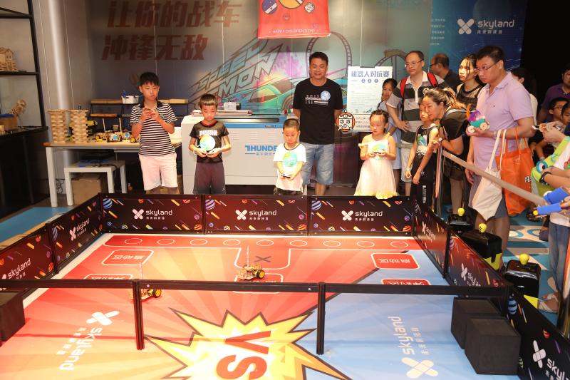 “我跟你說噢,那邊吹出來的泡泡能把我們倆都包進(jìn)去!”“老媽,原來空氣的形狀是圓環(huán)形的呀……”歡聲笑語中,十幾項科技趣味項目讓小朋友們眼花繚亂、目不暇接,這其中,機(jī)器人對抗賽無疑是人氣最高的。賽場上,小朋友們分為紅藍(lán)兩隊,手持遙控器在兩側(cè)站好?!靶∨笥褌冏⒁饫玻恳晃粰C(jī)器人身上有一個藍(lán)色燈柱,碰撞擋板被撞到后,燈柱長度會縮短……”老師一邊在“戰(zhàn)場”中擺放機(jī)器人,一邊為孩子們詳細(xì)講解規(guī)則。一聲哨響,紅藍(lán)兩隊的“機(jī)器人大戰(zhàn)”拉開了帷幕,孩子們操控著自己的戰(zhàn)車,左右閃躲,時而用一個漂亮的側(cè)移甩掉追擊者,時而全力沖擊消耗對方的“藍(lán)條”。賽場邊的家長們似乎比小選手更為緊張,他們時不時俯下身子,為孩子們出謀劃策:“小超你看,邊上那個三號車藍(lán)條快沒了,快趕過去補(bǔ)一下!”一位父親看到了打破僵局的好機(jī)會,急忙提醒道,小朋友則心領(lǐng)神會,熟練的操縱著機(jī)器人貼了上去……經(jīng)過一番努力,在成功拿下這寶貴的一分后,小朋友回頭與自己的老爸相視一笑,父子二人之間的默契,在這一刻體現(xiàn)的淋漓盡致。