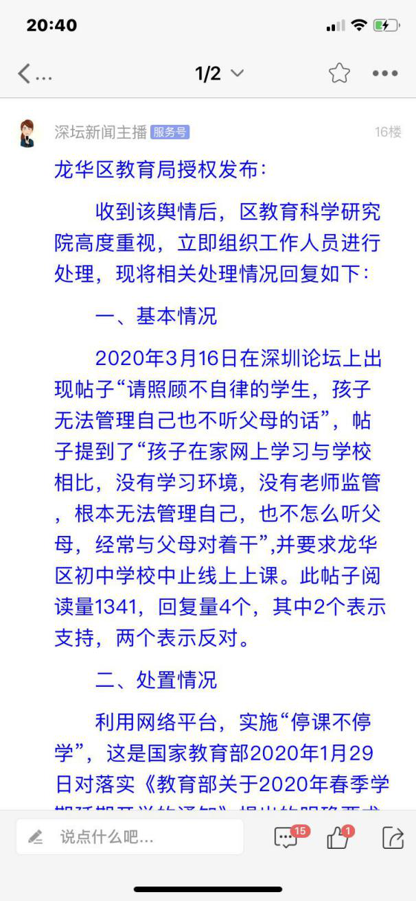 3月23日,針對(duì)市民的問題,龍華區(qū)教育局通過深圳論壇進(jìn)行了公開回應(yīng),利用網(wǎng)絡(luò)平臺(tái),實(shí)施“停課不停學(xué)”,這是國家教育部2020年1月29日對(duì)落實(shí)《教育部關(guān)于2020年春季學(xué)期延期開學(xué)的通知》提出的明確要求與重要舉措。義務(wù)教育學(xué)段在線教學(xué)開課時(shí)間擬定從2月17日起至3月17日,具體線下課堂上課時(shí)間,以市教育局通知復(fù)課時(shí)間為準(zhǔn)。我區(qū)義務(wù)教育階段實(shí)施在線教學(xué)也是從2月17日開始,直到接到上級(jí)通知復(fù)課的文件為止。而現(xiàn)階段仍沒接到相關(guān)停止線上教學(xué)的文件通知。