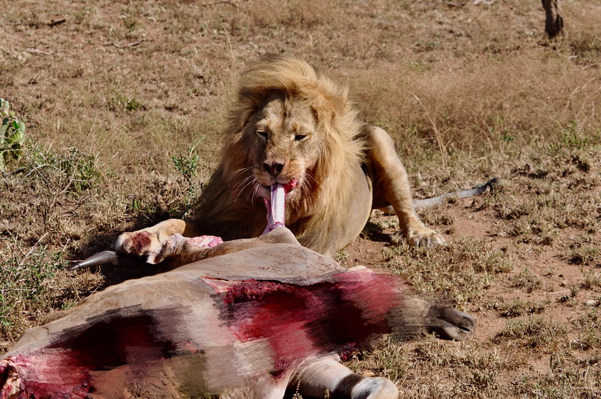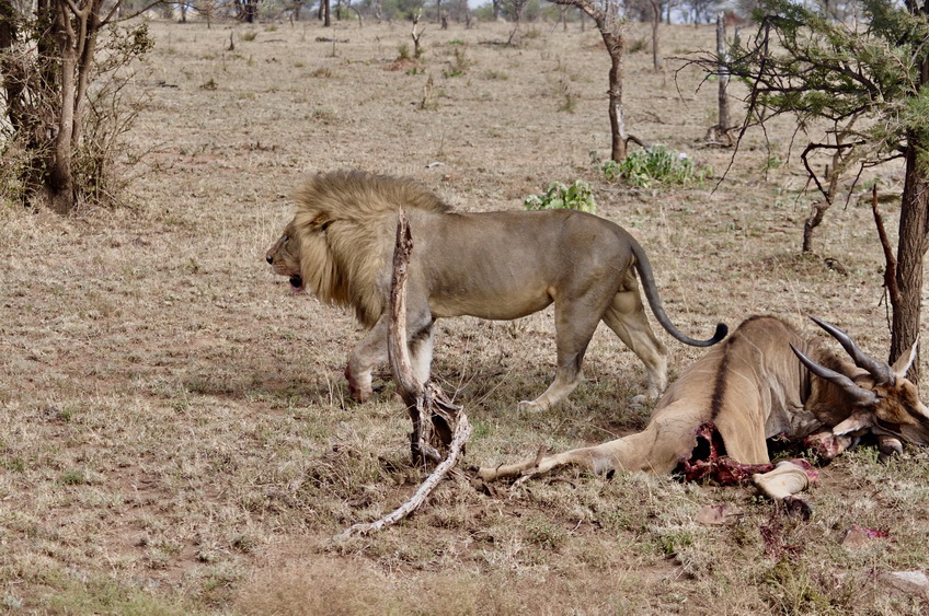 作者運氣不錯,在塞倫蓋蒂巡游時巧遇一頭雄獅守護在一頭被咬死的大羚羊旁。李仁奇 攝