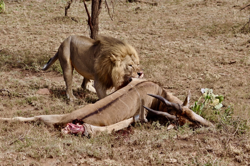這頭估計重達二、三百斤的大羚羊是早晨被三頭雌獅捕獲的,雄獅趕到后,雌獅們各自撕扯一塊肉到遠處享用去了。雄獅腹中饑餓,不顧乘坐兩臺越野車的十位游客近在咫尺,只管用力撕咬拖拽羚羊尸體。李仁奇 攝