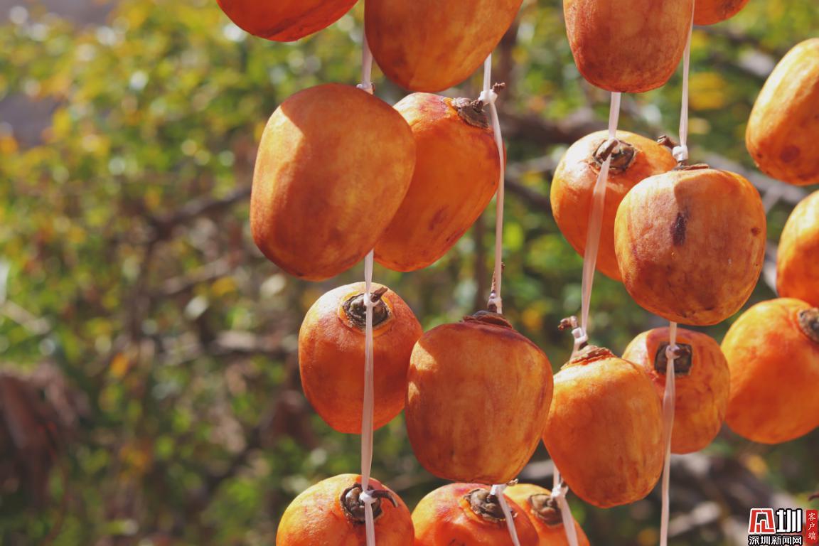 曬架上放著柿子、玉米等五彩繽紛的豐收成果。
