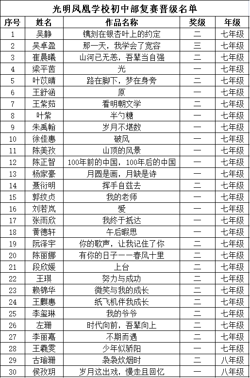 自2021年1月,活動(dòng)征稿啟動(dòng)以來(lái),獲得了深圳市廣大中小學(xué)生、教師、文學(xué)愛(ài)好者的熱烈響應(yīng)積極參與,吸引了深圳百余所學(xué)校的上萬(wàn)人關(guān)注報(bào)名?,F(xiàn)公布光明區(qū)鳳凰學(xué)校晉級(jí)復(fù)賽名單如下: