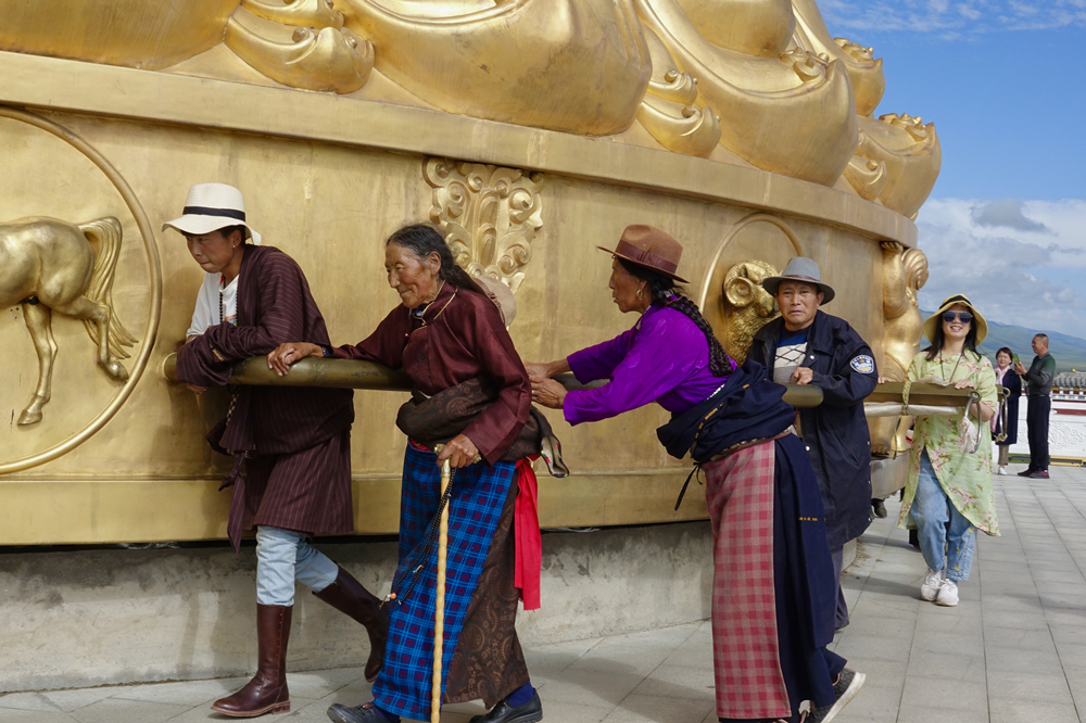 甘肅甘南藏族自治州瑪曲縣的寧瑪寺大藏經轉經筒矗立在金碧輝煌的寺院建筑群里,總投資4500萬元,歷經四年,于2018年建成。筒體浮雕由尼泊爾工匠使用60公斤黃金手工鍛鑄鎏金而成。轉經筒自身重量達320噸,內裝大藏經1008部共11萬冊。李仁奇 攝
