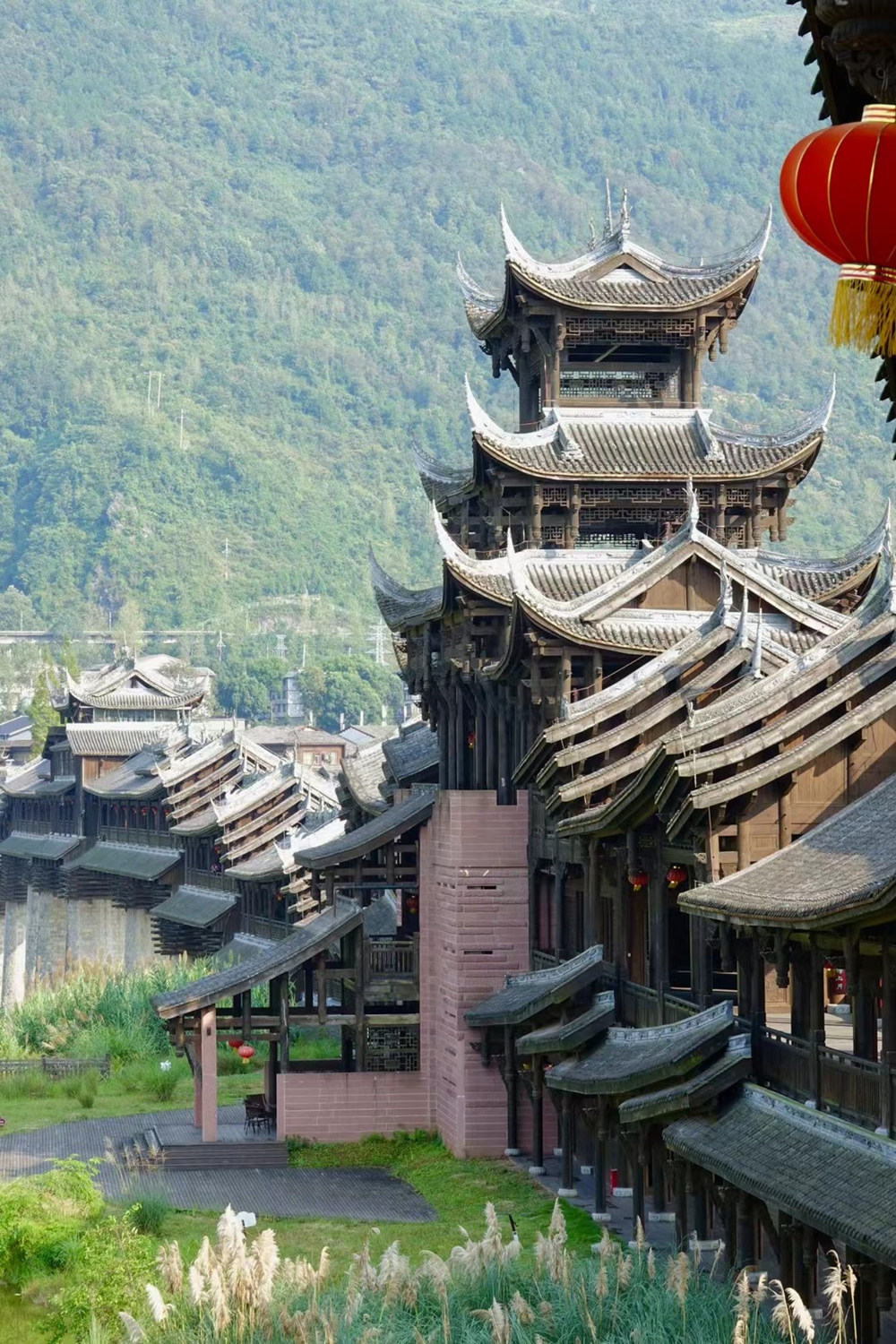 濯水廊橋長(zhǎng)658米、寬5米,分為橋、塔、亭三部分,橋身為純木結(jié)構(gòu),建筑材料之間以榫頭卯眼互相穿插銜接,直套斜穿,牢固精密。李仁奇 攝