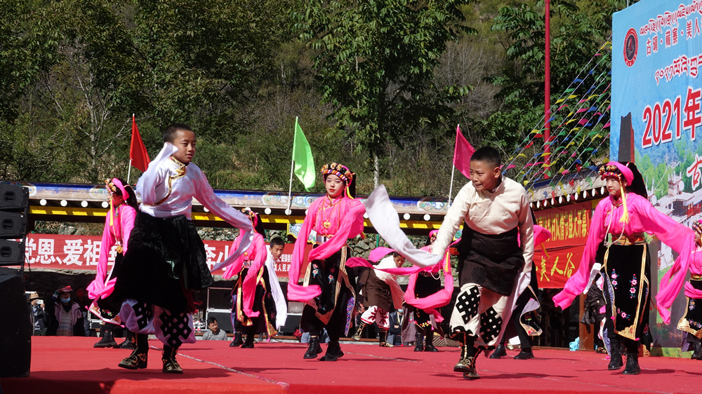 巴底小學(xué)的同學(xué)們身著嘉絨服飾,舞蹈結(jié)合丹巴傳統(tǒng)歌舞藝術(shù),充分展現(xiàn)了丹巴深厚的文化底蘊(yùn)。李仁奇 攝