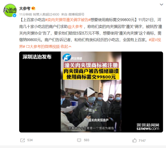 6.【法治事件】全國多個經(jīng)營肉夾饃的店家“潼關(guān)肉夾饃”這幾個字不能用了,不但要賠償給潼關(guān)肉夾饃協(xié)會3萬到5萬元不等的賠償金,要繼續(xù)用這個商標(biāo),還得向協(xié)會交99800元。11月26日,國家知識產(chǎn)權(quán)局針對“逍遙鎮(zhèn)胡辣湯”和“潼關(guān)肉夾饃”的商標(biāo)糾紛事件做了回應(yīng)。當(dāng)天,潼關(guān)肉夾饃協(xié)會就“潼關(guān)肉夾饃”商標(biāo)進(jìn)行維權(quán)一事向全國潼關(guān)肉夾饃經(jīng)營者道歉。