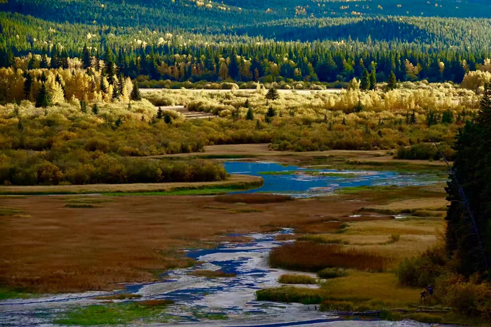 班夫朱砂湖也叫微米里翁湖,是位于園內(nèi)的一片濕地群,其中國(guó)式名稱可能是因?yàn)楹嫔嫌写笃募t色水草。李仁奇 攝