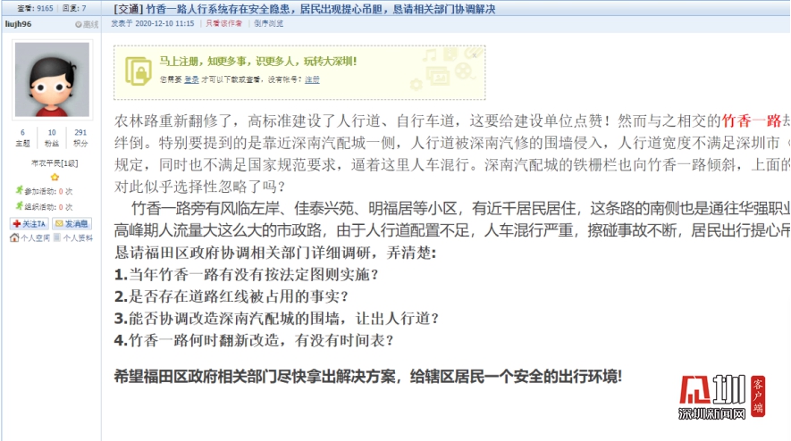 記者了解到,竹香一路附近有多個(gè)住宅小區(qū),近千名居民,同時(shí)附近有多所學(xué)校,該路段也是附近居民學(xué)生的必經(jīng)之路。2020年12月10日,網(wǎng)友“l(fā)iujh96”發(fā)帖報(bào)料后,2020年12月22日,福田區(qū)香蜜湖街道辦事處在論壇做了回應(yīng)。該回復(fù)稱正積極協(xié)調(diào)查,尋找當(dāng)年竹香一路代建單位,督促其移交道路至交通局,由于該路段尚未移交交通局管養(yǎng),暫無法重新規(guī)劃整改道路。