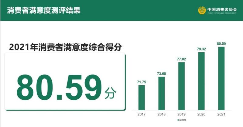 測評結(jié)果顯示,2021年度100個(gè)城市消費(fèi)者滿意度綜合得分為80.59分,較2020年提高1.27分,且首次突破80分。