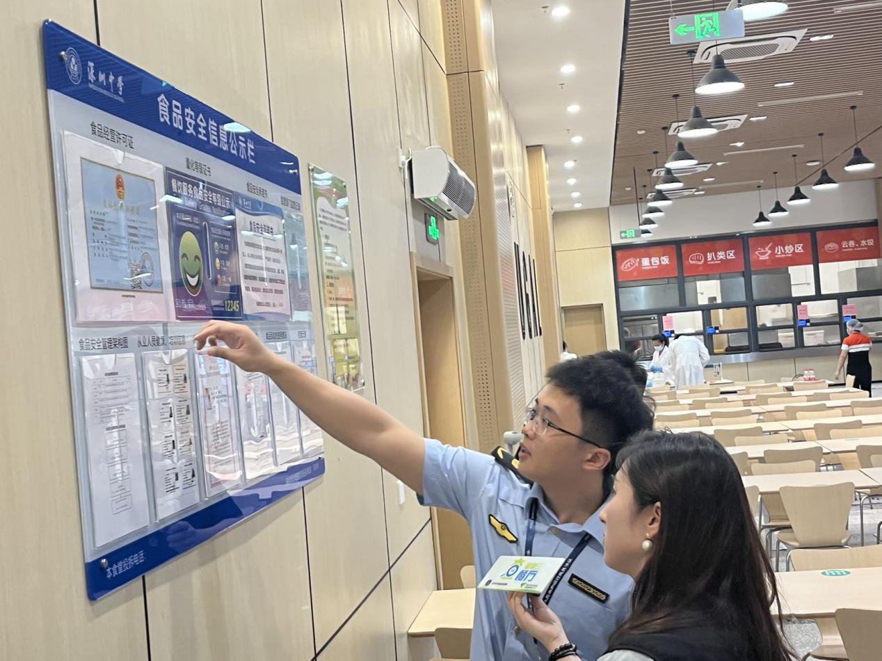 在食堂用餐區(qū),執(zhí)法人員依次查看食品安全公示欄、明廚亮灶系統(tǒng)、用餐區(qū)域消毒記錄等信息。檢查過程中發(fā)現(xiàn)部分從業(yè)人員健康證即將到期,深圳市市場監(jiān)督管理局羅湖監(jiān)管局執(zhí)法人員羅偉仁提醒,為保護(hù)從業(yè)人員自身及服務(wù)對象的健康,應(yīng)盡快更新辦理從業(yè)人員健康證。