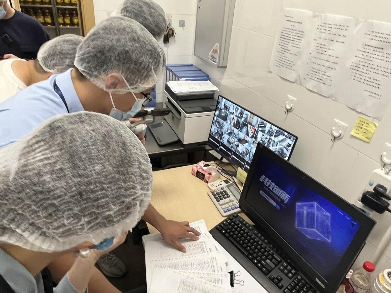 隨后,執(zhí)法人員一行進(jìn)入食堂后廚,對面點(diǎn)間、儲藏間、清洗區(qū)、冷凍庫等各分區(qū)進(jìn)行執(zhí)法檢查。經(jīng)查,后廚整體布局合理,其中食材存儲符合規(guī)定且日期均在保質(zhì)期內(nèi);留樣冰箱內(nèi)按規(guī)定保存了近期餐食樣品,留樣品名及時間標(biāo)注清晰,確保了來源可追溯;清洗區(qū)分區(qū)明確,刀具砧板按照顏色管理,有效避免了交叉感染。此外,在后廚辦公室,執(zhí)法人員查看了索證索票落實(shí)情況及日管控、周排查、月調(diào)度等相關(guān)制度管理資料,各類信息管理較完善。
