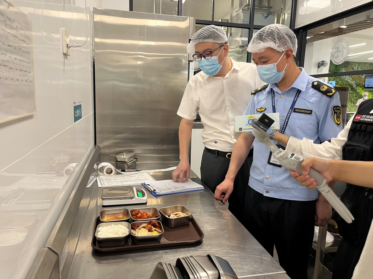 執(zhí)法人員現(xiàn)場對學校后廚進行詳細檢查,分別從采購索證索票、進貨查驗、制作加工、備餐配送、場所和設施清潔維護、餐飲具清洗消毒、從業(yè)人員健康管理,制止餐飲浪費,食品安全總監(jiān)配置履職情況,以及落實主體責任的“日管控周排查月調(diào)度”制度等方面進行詳細檢查。經(jīng)檢查,整體情況良好,但存在部分細節(jié)問題,如水產(chǎn)品刀具分類可更細致、操作臺積水需清理、面點間的食材存放需避免陽光直射等,針對檢查過程中發(fā)現(xiàn)的問題,執(zhí)法人員現(xiàn)場責令學校限期整改到位。同時,快檢工作人員對餐廳使用的食材進行了抽檢,結(jié)果均為陰性。