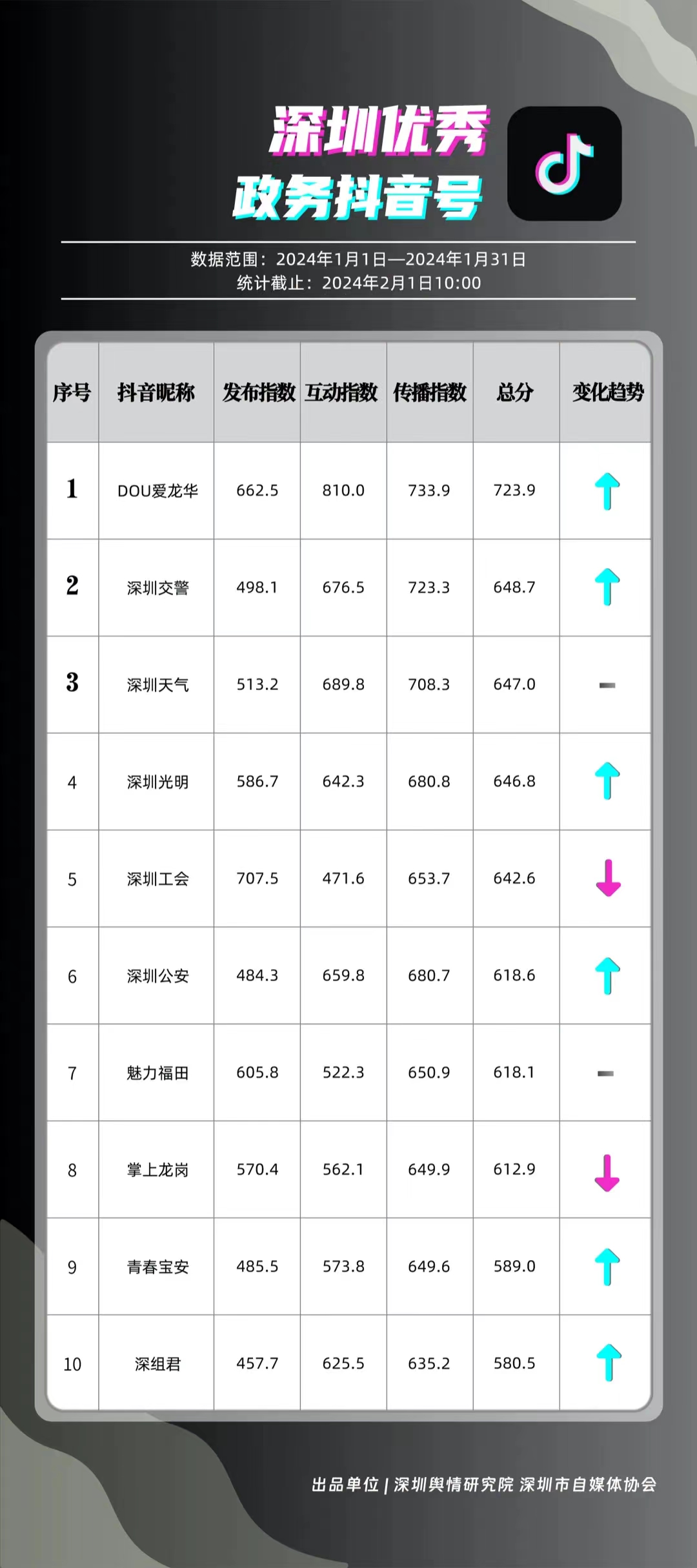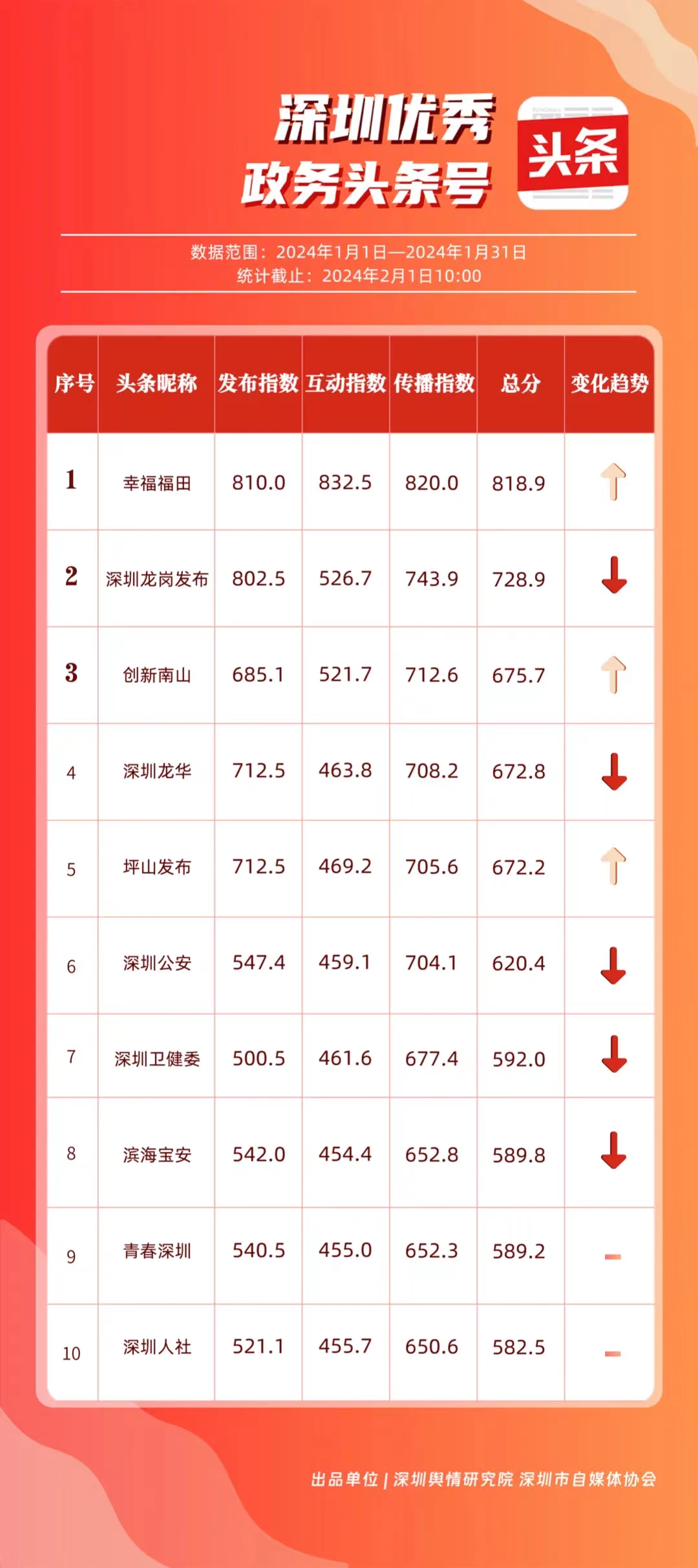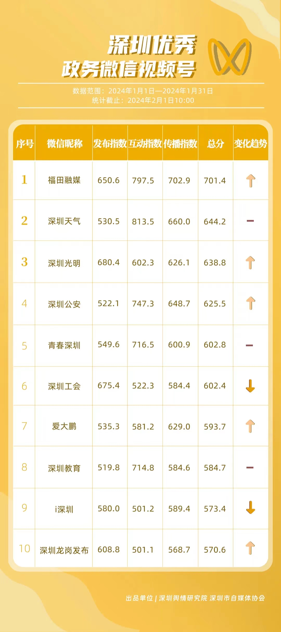 深圳新聞網(wǎng)2月9日訊(記者 陳曉君 實習生 張馳)2月8日,深圳輿情研究院、深圳市自媒體協(xié)會聯(lián)合推出《深圳優(yōu)秀政務新媒體矩陣》(2024年1月期),市衛(wèi)生健康委、市氣象局、福田區(qū)、光明區(qū)、龍崗區(qū)、龍華區(qū)、市公安局、市應急管理局、市交通警察局、羅湖區(qū)的新媒體矩陣獲評“深圳優(yōu)秀政務新媒體矩陣”。這些矩陣在內(nèi)容發(fā)布、受眾互動和信息傳播方面取得了較好成績,并在深圳政務新媒體規(guī)范有序發(fā)展進程中發(fā)揮著積極作用。