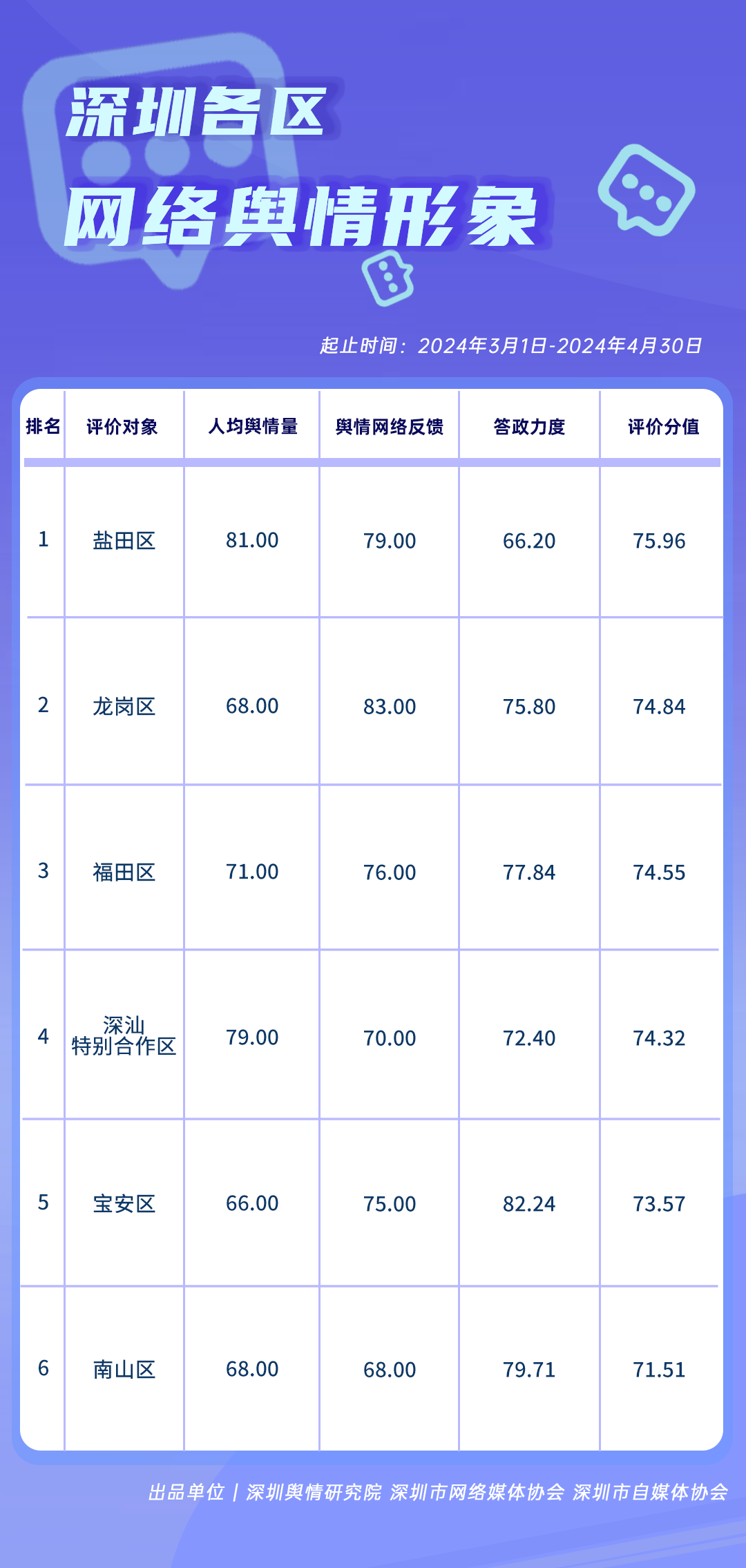3-4月,福田區(qū)、龍崗區(qū)、南山區(qū)、鹽田區(qū)、大鵬新區(qū)、深汕特別合作區(qū)的網(wǎng)絡(luò)形象建設(shè)工作頗具成效,依次登上《深圳各區(qū)網(wǎng)絡(luò)形象建設(shè)榜》。其中,福田區(qū)榮登榜首,綜合形象得分為81.95分,且新媒體傳播形象得分達(dá)96.33分,展現(xiàn)出其以新媒體形象塑造為著力點(diǎn),推進(jìn)綜合網(wǎng)絡(luò)形象建設(shè)工作的一面。緊隨其后的是龍崗區(qū),綜合形象得分接近80分,整體表現(xiàn)領(lǐng)先于其他多區(qū),說明龍崗區(qū)在完善基層治理體系、維護(hù)良好網(wǎng)絡(luò)口碑等方面作出了較大努力。居于榜單第三至六名的南山區(qū)、鹽田區(qū)、大鵬新區(qū)和深汕特別合作區(qū),在網(wǎng)絡(luò)形象建立及優(yōu)化方面也具有可圈可點(diǎn)的表現(xiàn),如鹽田區(qū)積極完善民生保障制度,賦能群眾美好生活,提升群眾的社會(huì)生活滿意度,南山區(qū)則借力政務(wù)新媒體矩陣,持續(xù)深化政務(wù)信息傳播工作,擴(kuò)大新媒體矩陣影響力。