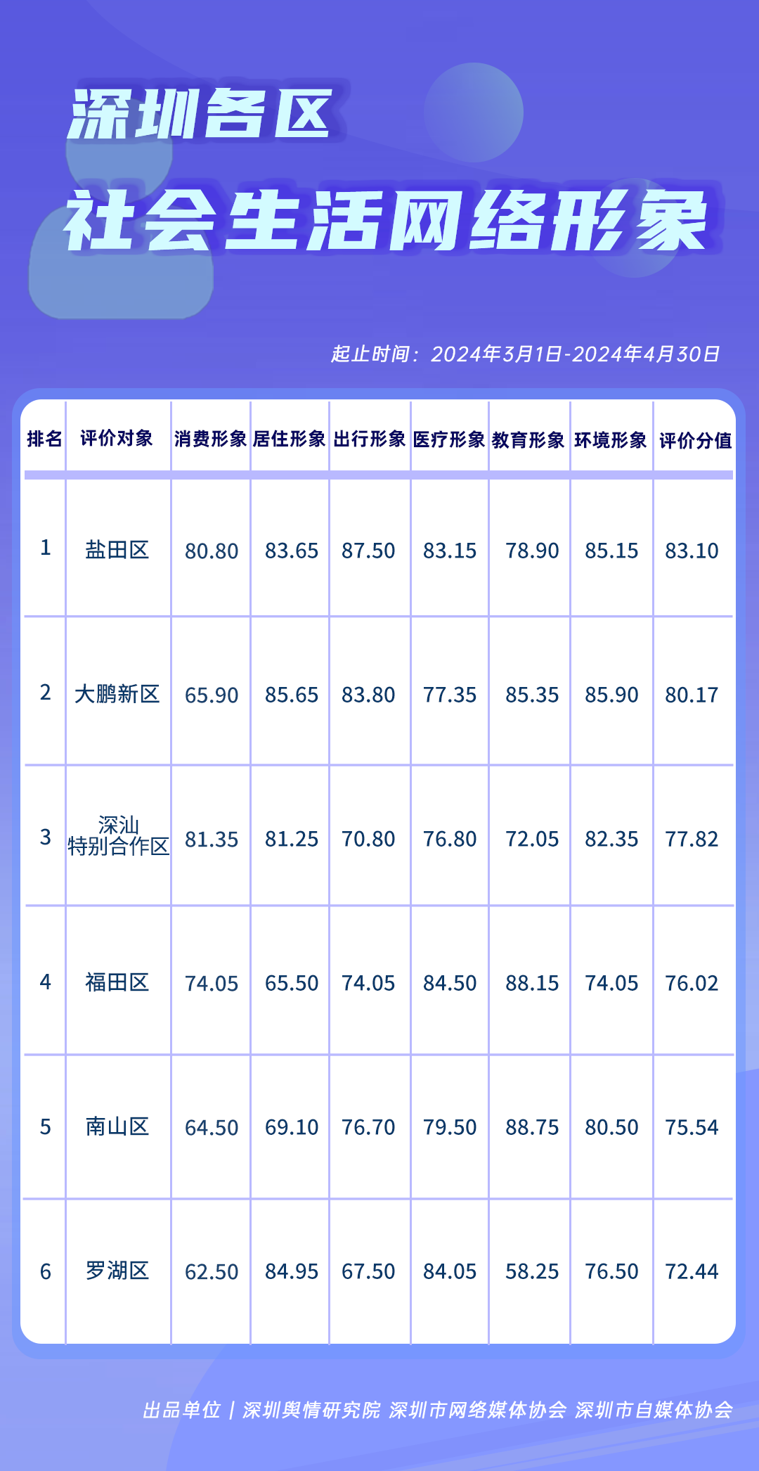 3-4月《深圳各區(qū)社會(huì)生活網(wǎng)絡(luò)形象榜》顯示,位居榜單第一名的鹽田區(qū),評(píng)價(jià)分值為83.10分,且消費(fèi)、居住、出行、醫(yī)療和環(huán)境形象方面均高于80分,整體社會(huì)生活網(wǎng)絡(luò)形象較佳。緊隨其后的大鵬新區(qū)在居住、教育和環(huán)境形象建設(shè)方面,取得的分?jǐn)?shù)都高于85分,表明該區(qū)在打造優(yōu)美宜居生活環(huán)境過程中收獲了較好反饋。位列第三的深汕特別合作區(qū),在消費(fèi)、居住、環(huán)境形象方面表現(xiàn)也相對(duì)較好,得分均在80分以上,助推其社會(huì)生活網(wǎng)絡(luò)形象綜合得分走高。福田區(qū)、南山區(qū)、羅湖區(qū)分別占據(jù)了榜單第四,第五和第六的位置,評(píng)價(jià)分值依次為76.02分、75.54分、72.44分,綜合水平良好,后續(xù)若能充分發(fā)揮優(yōu)勢(shì),著力補(bǔ)齊短板,排名有望持續(xù)提升。