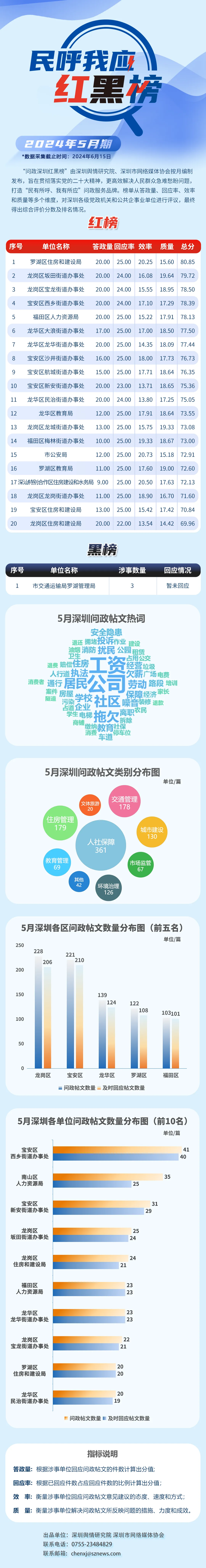 本期榜單采集的帖文主要來自深圳市及各區(qū)政府官網(wǎng)、深圳論壇、人民網(wǎng)領導留言板、深圳新聞網(wǎng)“民呼我應”等平臺,所采集帖文發(fā)布時間為2024年5月1日至5月31日,采集截止時間為2024年6月15日。