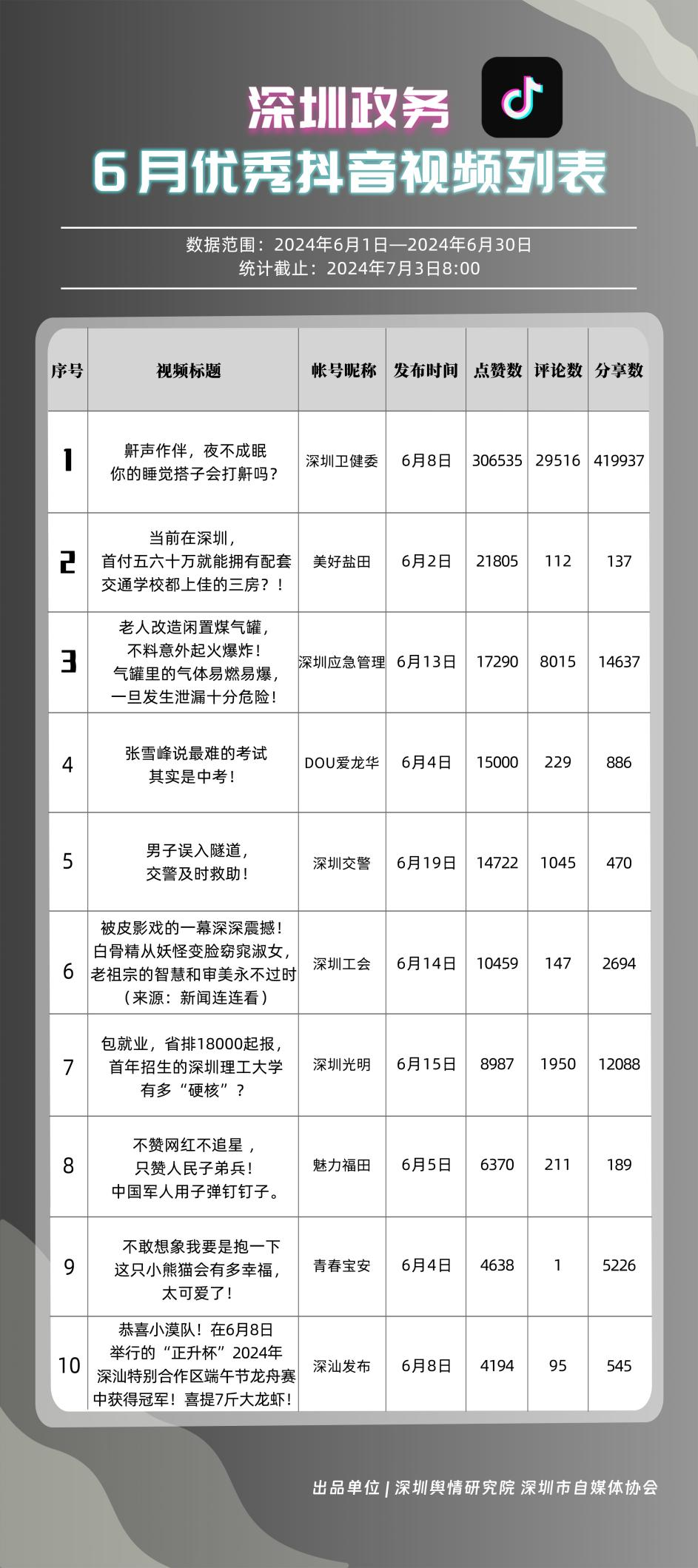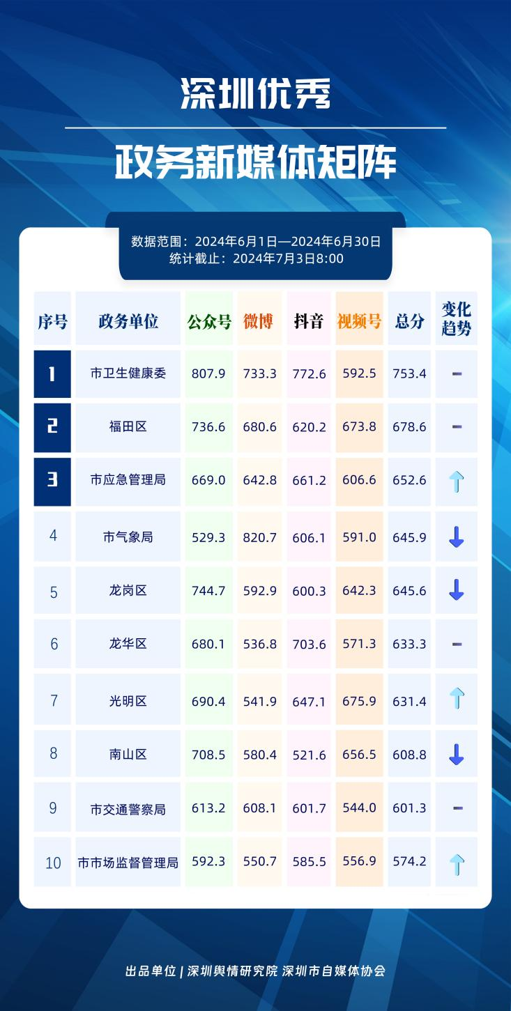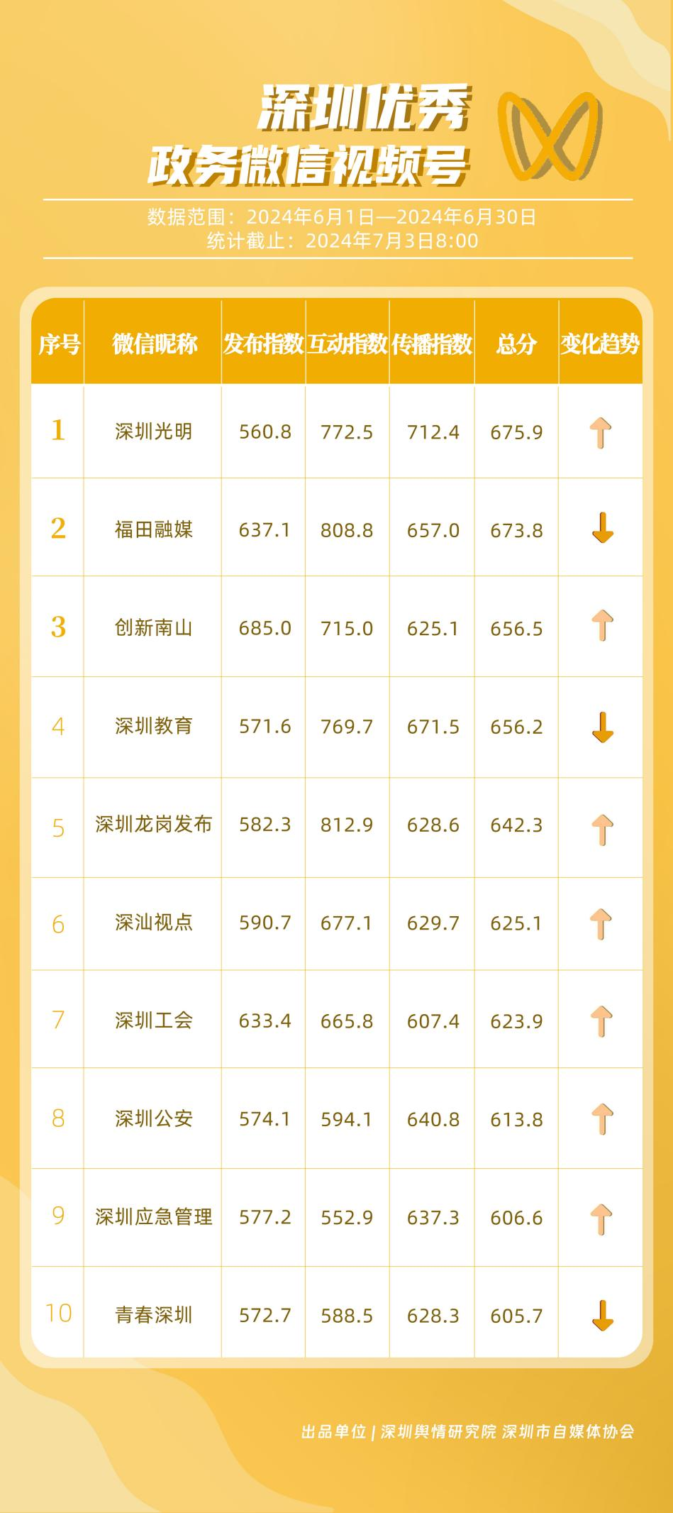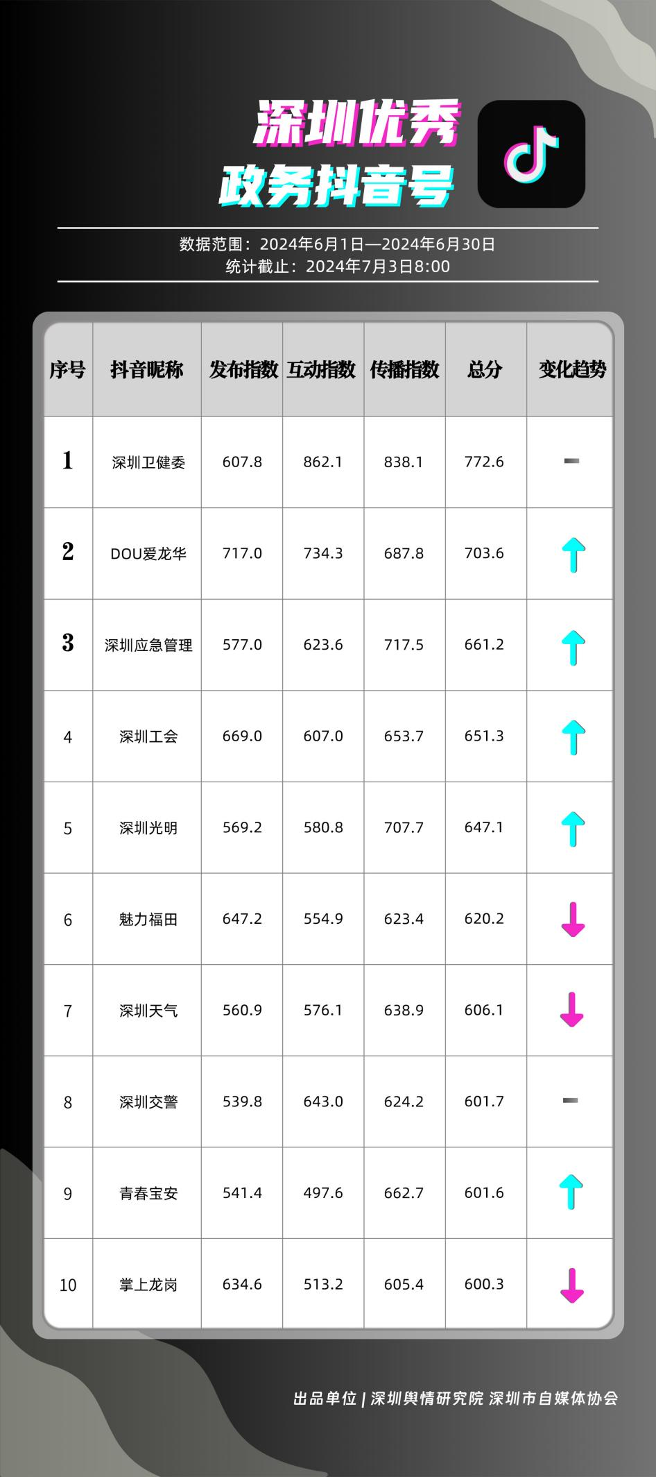 榜單在持續(xù)展示深圳政務(wù)新媒體矩陣建設(shè)成效的同時,梳理總結(jié)了深圳政務(wù)微信公眾號、微信視頻號、微博號、抖音號、頭條號的運(yùn)營方法與經(jīng)驗(yàn),是政務(wù)公開、回應(yīng)群眾關(guān)切的重要載體。6月,又有哪些政務(wù)新媒體取得優(yōu)異成績呢?《深圳優(yōu)秀政務(wù)新媒體矩陣》(2024年6月期)邀您共同關(guān)注。