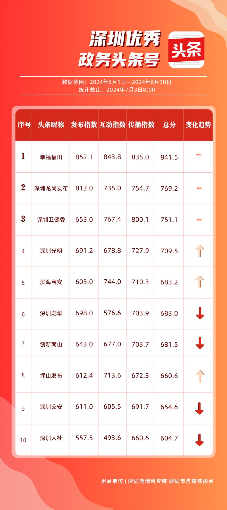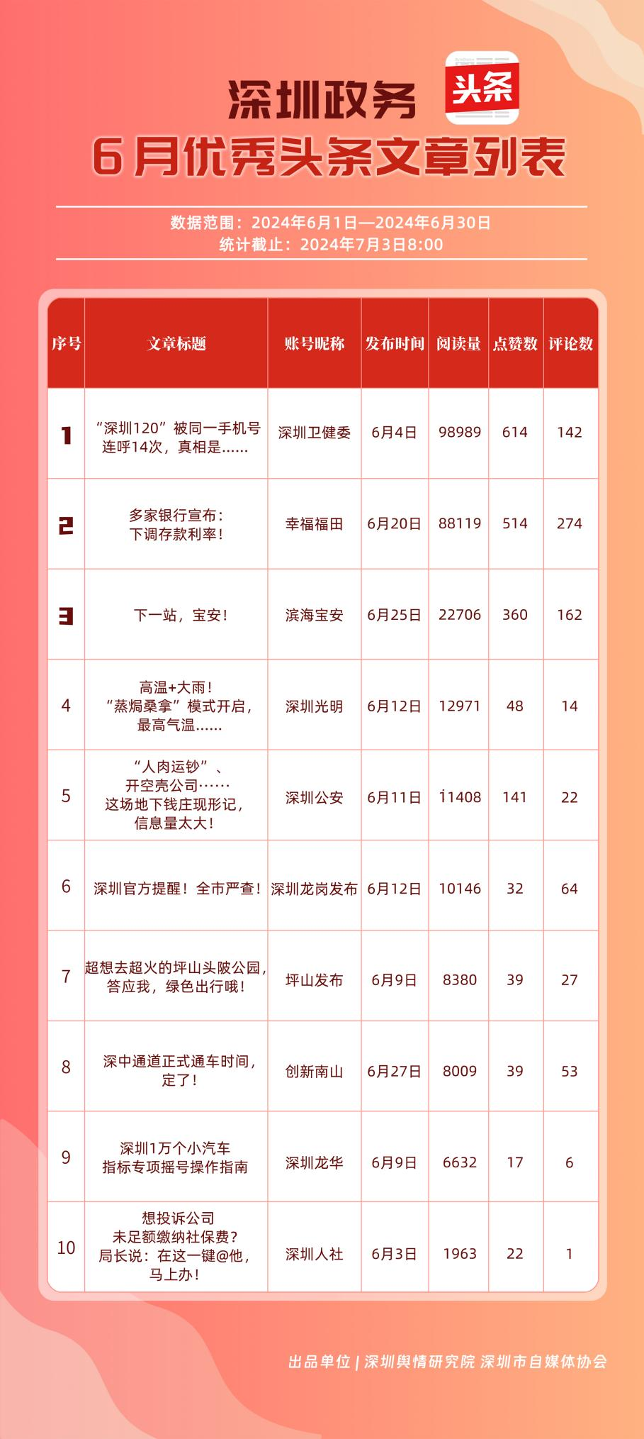 6月,“幸福福田”“深圳龍崗發(fā)布”“深圳衛(wèi)健委”“深圳光明”“濱海寶安”“深圳龍華”“創(chuàng)新南山”“坪山發(fā)布”“深圳公安”“深圳人社”共10個政務(wù)頭條號能夠及時發(fā)布政務(wù)信息及公共服務(wù)信息,入列“優(yōu)秀政務(wù)頭條號”榜單。從數(shù)據(jù)上分析,《“深圳120”被同一手機(jī)號連呼14次,真相是……》《多家銀行宣布:下調(diào)存款利率!》《下一站,寶安!》等優(yōu)秀文章為網(wǎng)民提供醫(yī)療急救、經(jīng)濟(jì)政策、區(qū)域發(fā)展等領(lǐng)域的信息,發(fā)揮各自賬號在信息傳播、公共服務(wù)等方面的重要功能,收獲較高點(diǎn)贊。
