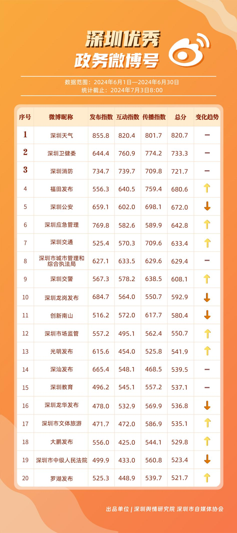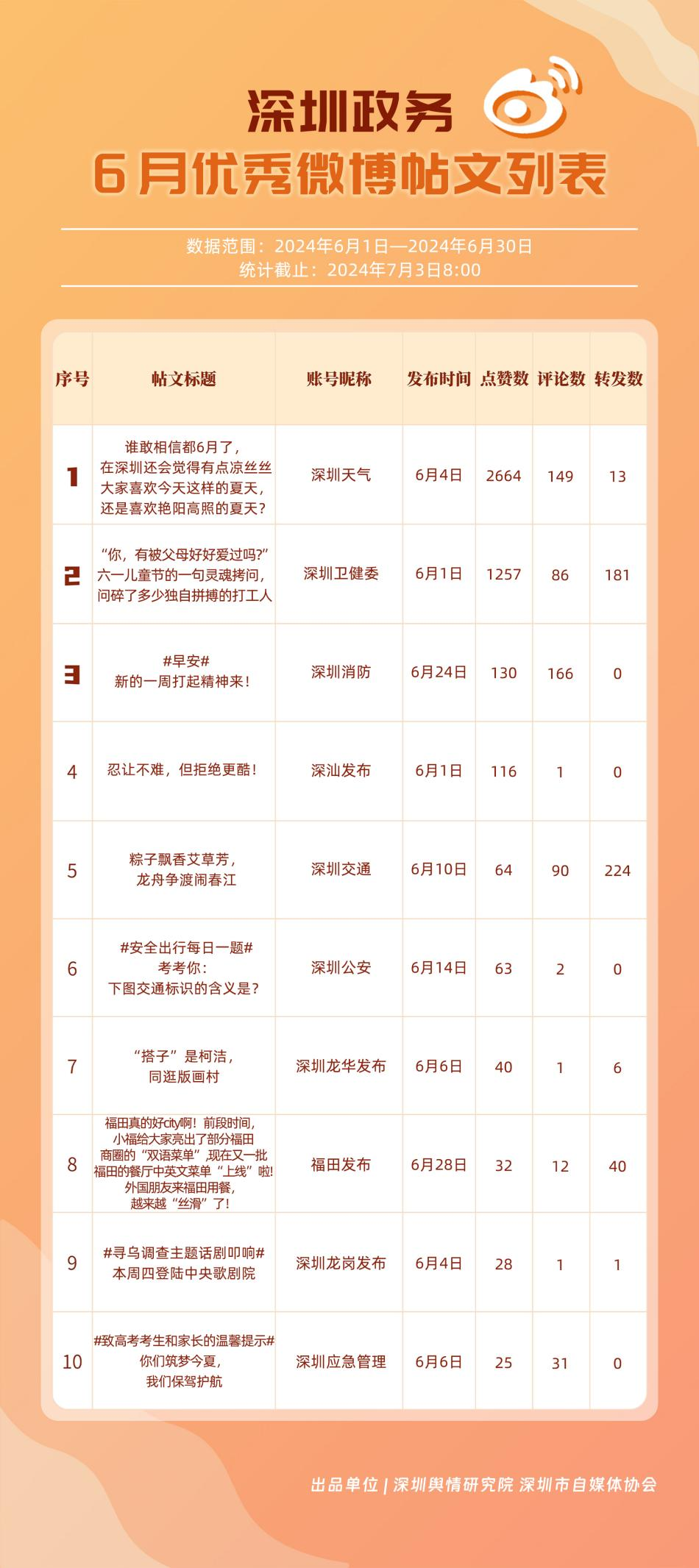 6月,“深圳天氣”“深圳衛(wèi)健委”“深圳消防”“福田發(fā)布”“深圳公安”“深圳應(yīng)急管理”“深圳交通”“深圳市城市管理和綜合執(zhí)法局”“深圳交警”“深圳龍崗發(fā)布”等20個政務(wù)微博號入列“優(yōu)秀”名單?!吧钲谔鞖狻薄吧钲谛l(wèi)健委”“深圳消防”等賬號抓住微博平臺的傳播特征,持續(xù)輸出優(yōu)質(zhì)內(nèi)容,滿足受眾需求,不斷提高用戶體驗(yàn)和傳播效果。