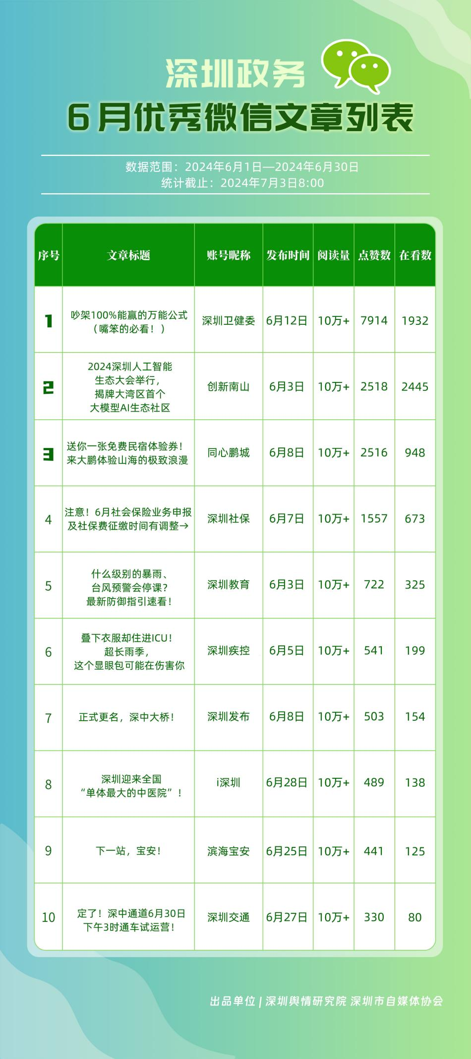 6月,“深圳衛(wèi)健委”“i深圳”“深圳龍崗發(fā)布”“幸福福田”“深圳交通”“深圳教育”“濱海寶安”“創(chuàng)新南山”“深圳工會”“青春深圳”“同心鵬城”“深圳光明”等30個政務(wù)微信公眾號,被評為“深圳優(yōu)秀政務(wù)微信公眾號”。6月,“深圳衛(wèi)健委”因內(nèi)容策劃出色、受眾互動活躍、作品火熱“出圈”等,榮登排行榜首位?!皠?chuàng)新南山”“同心鵬城”“深圳社保”“深圳教育”等上榜公眾號也積極創(chuàng)作優(yōu)質(zhì)作品,抓住時下熱點(diǎn)趨勢,集中發(fā)揮政務(wù)媒體傳播力量,推動了政務(wù)信息傳播工作提質(zhì)增效。