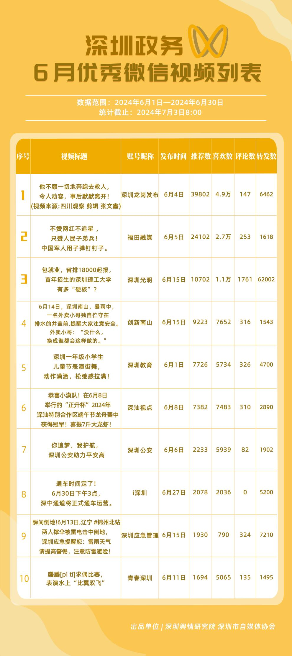 6月,政務(wù)微信視頻號“深圳光明”“福田融媒”“創(chuàng)新南山”“深圳教育”“深圳龍崗發(fā)布”“深汕觀點(diǎn)”“深圳工會”“深圳公安”“深圳應(yīng)急管理”和“青春深圳”榮獲“深圳優(yōu)秀政務(wù)微信視頻號”稱號。結(jié)合整體數(shù)據(jù)來看,6月深圳政務(wù)視頻號平臺推出多條爆款視頻,如《他不顧一切地奔跑去救人,令人動容,事后默默離開!》《不贊網(wǎng)紅不追星,只贊人民子弟兵!中國軍人用子彈釘釘子》等作品,收獲了上萬的推薦數(shù)和喜歡數(shù),是政務(wù)信息傳播高效化和正能量傳播機(jī)制的體現(xiàn)。