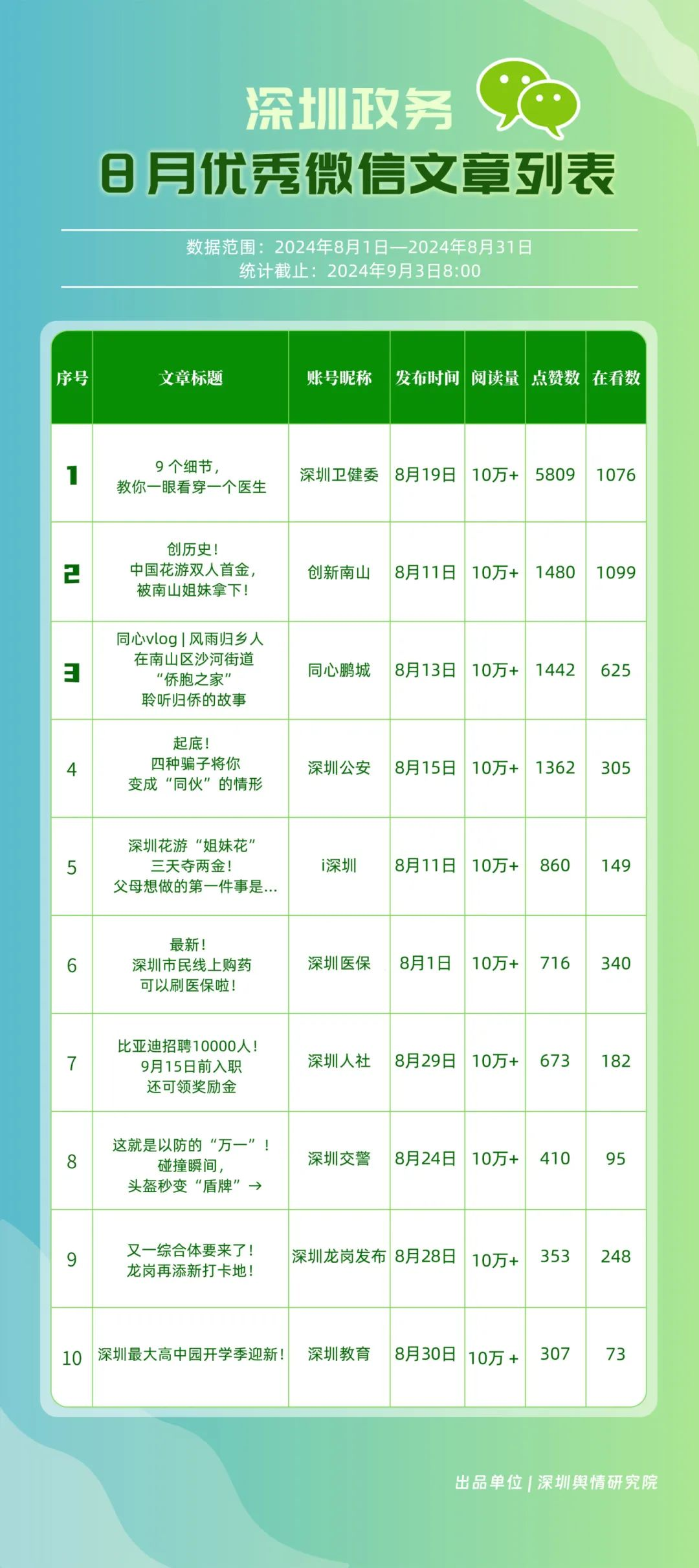 8月,“幸福福田”“深圳龍崗發(fā)布”“深圳衛(wèi)健委”“深圳龍華”“創(chuàng)新南山”“深圳人社”“深圳光明”“羅湖發(fā)布”“濱海寶安”和“坪山發(fā)布”共10個政務(wù)頭條號入選榜單。相關(guān)賬號的文章《“為愛瘋狂,怎么3天后‘下面’喜提美乃滋?”》《最新消息!價格即將調(diào)整!時間就在→》等貼近民生,傳遞實(shí)用信息,收獲了較高的閱讀量和點(diǎn)贊數(shù)。