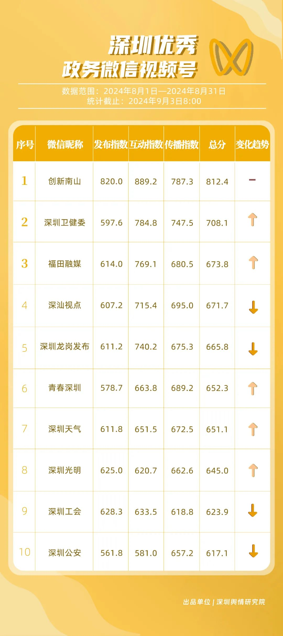 8月,“深圳衛(wèi)健委”“深汕發(fā)布”“掌上龍崗”“魅力福田”“深圳天氣”“深圳工會”“DOU愛龍華”“PMC坪山發(fā)布”“深圳交警”和“深圳公安”共10個政務(wù)抖音號獲得優(yōu)秀稱號,“深圳衛(wèi)健委”“深汕發(fā)布”“掌上龍崗”以高分居榜單前三,賬號有關(guān)“醫(yī)師節(jié)”“猴痘”“奧運(yùn)金牌”的視頻獲得了較高的關(guān)注度和討論度,相關(guān)優(yōu)秀視頻在傳播信息的同時,也展現(xiàn)了深圳政務(wù)抖音號在內(nèi)容質(zhì)量、互動性和傳播度方面的實(shí)力。