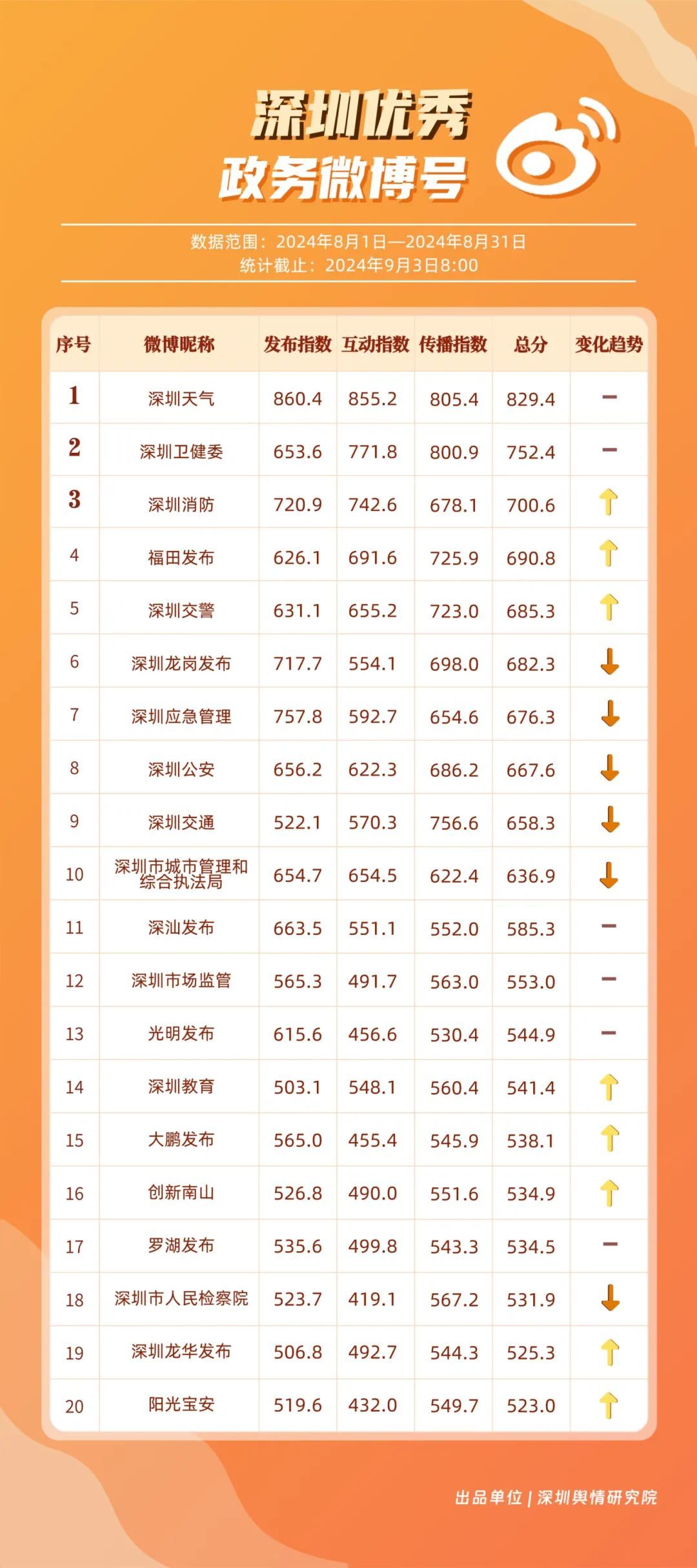 8月,“深圳天氣”“深圳衛(wèi)健委”“深圳消防”“福田發(fā)布”“深圳交警”“深圳龍崗發(fā)布”“深圳應(yīng)急管理”“深圳公安”“深圳交通”“深圳市城市管理和綜合執(zhí)法局”等20個政務(wù)微博號發(fā)布高質(zhì)量信息,入選優(yōu)秀政務(wù)微博號。其中,“深圳天氣”“深圳衛(wèi)健委”持續(xù)保持領(lǐng)先地位;“深圳消防”“福田發(fā)布”“深圳交警”等賬號有效優(yōu)化發(fā)布內(nèi)容和互動策略,排名有所提升。