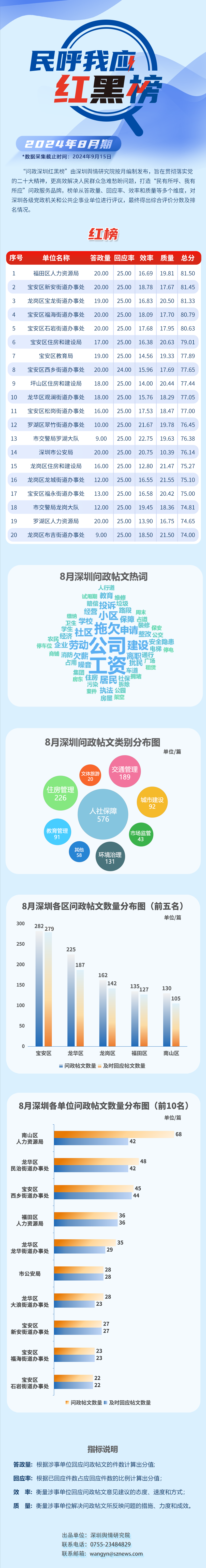 “深圳民呼我應(yīng)紅黑榜”由深圳輿情研究院按月編制發(fā)布,旨在貫徹落實黨的二十大精神,更高效解決人民群眾急難愁盼問題,打造“民有所呼、我有所應(yīng)”問政服務(wù)品牌。榜單從答政量、回應(yīng)率、效率和質(zhì)量等多個維度對深圳各級黨政機關(guān)和公共企事業(yè)單位進行評議,最終得出綜合評價分數(shù)及排名情況。